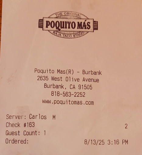 Read moreI was at Poquito Mas about four days ago the older man that was doing the cashiering was nice …chicken was undercooked but I came back because the man was really nice I came this time and I order a tostada I saw a bunch of tostada shells on the shelves I asked him if it was from yesterday or today he said it was from today he lied the shell was rubbery and did not taste fresh period!!!! how do I know them I’m a chef by trade I just wanted a little bit of Mexican food and I use to go there back in 2000 move up north came back to Burbank I was stunned about the flavor of the food hardly no salt salsa no salt flats tostadas bunch of beans with lettuce some chicken and 1 tablespoon of guacamole I asked if I could get some salad dressing they refused to give me some they could’ve said it would be extra and I would’ve paid for it they don’t give the choice to customer for extra sauce or all salad dressing for an extra charge you don’t give that option service was not desirable the young guy that work as a cashier had an attitude Jesus Mary and Joseph like he hates his job Cold attitude and a mean streak about him I was completely turned off hi younger person has a nasty attitude and the older man that work as a cashier had a better attitude have no word for your 4.3 rating Because in my book being in a restaurant business for 30+ year you do get 4.3 you get a 2.0 And I would’ve appreciated it if you would’ve told me it was a day-old tostada shell I would’ve ordered something else ….simply nasty What an experience on...