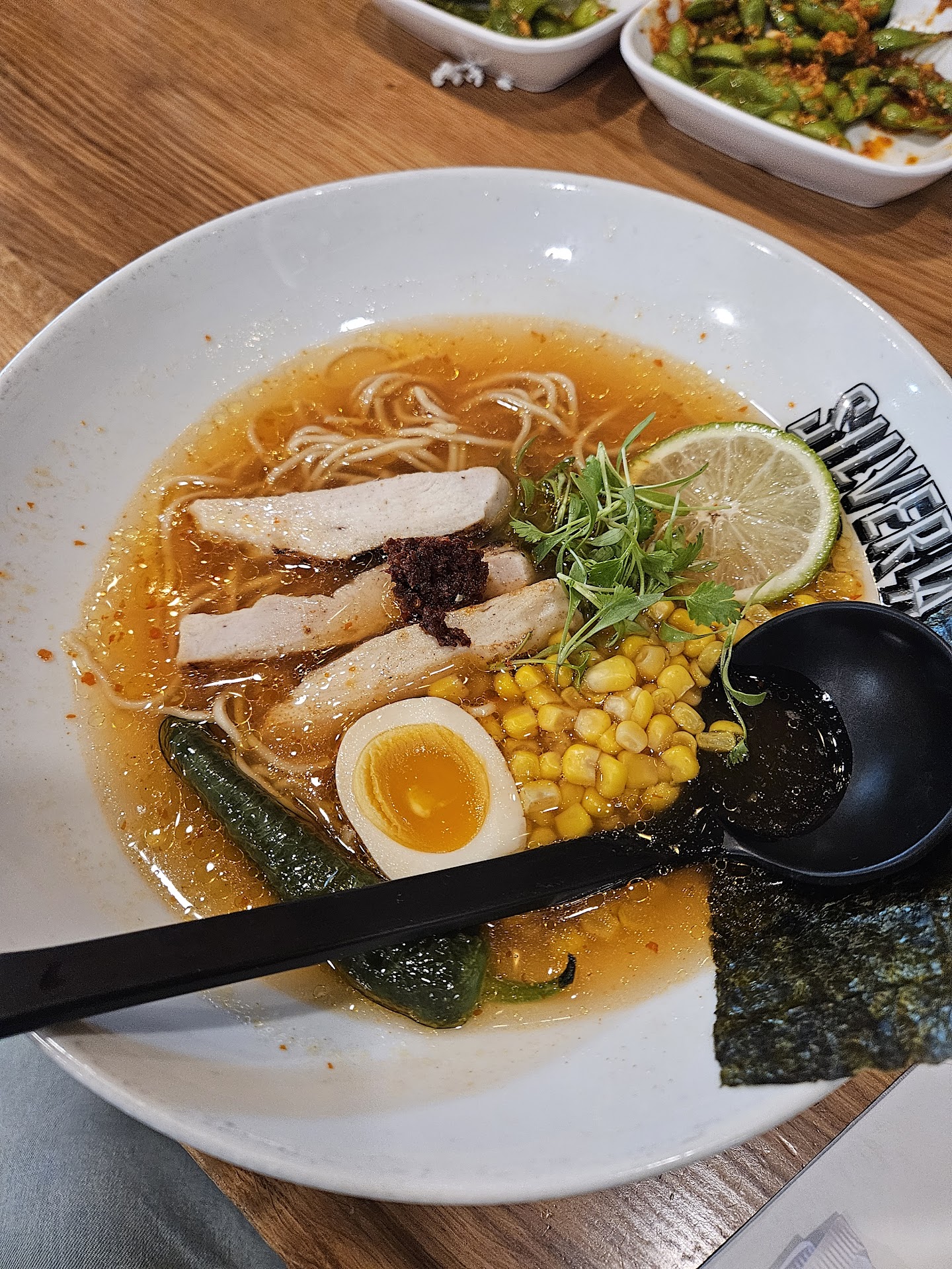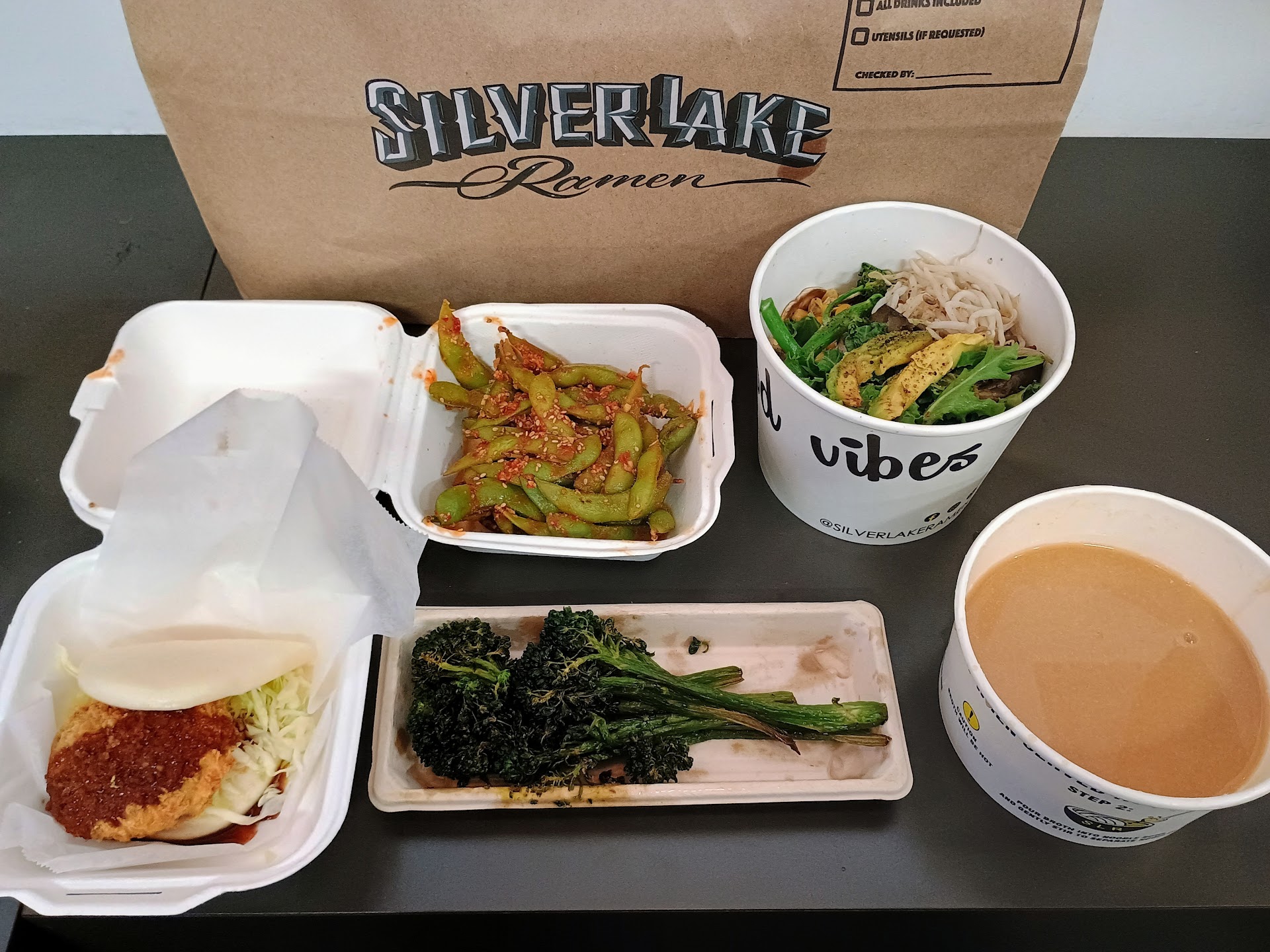 Read moreMy wife and I took my sister here for dinner here tonight after picking her up at Burbank airport. I parked at a private lot down the street and walked to this restrauant. They have a little stair to take you to the second level where it's for dining and there also a small elevator for people who are handicapped. We got seated pretty quick since they were not busy at all for a Monday night. My wife and I already knew what we wanted since we been to the other restrauant location before but our first time at this Burbank location. My sister never been to a Silverlake Ramen so we give her some recommendations. We started off with their spicy garlic edamame and then I got the Shoyu on Fire with chicken. My wife and my sister got the Blaze ramen with chicken as well. The edamame came out first and my sister along with my wife enjoyed it. It took our ramen a little while longer to come out because at other location, it would come out quick. I thought they made my ramen noodle dish well, the noodle was cooked perfectly and the soup was delicious. My sister loved her Blaze ramen too for her first time and my wife is never disappointed with her Blaze ramen dish. Our waitress was attentive to use and would refill our water when she saw it was low. We had a great time dining...