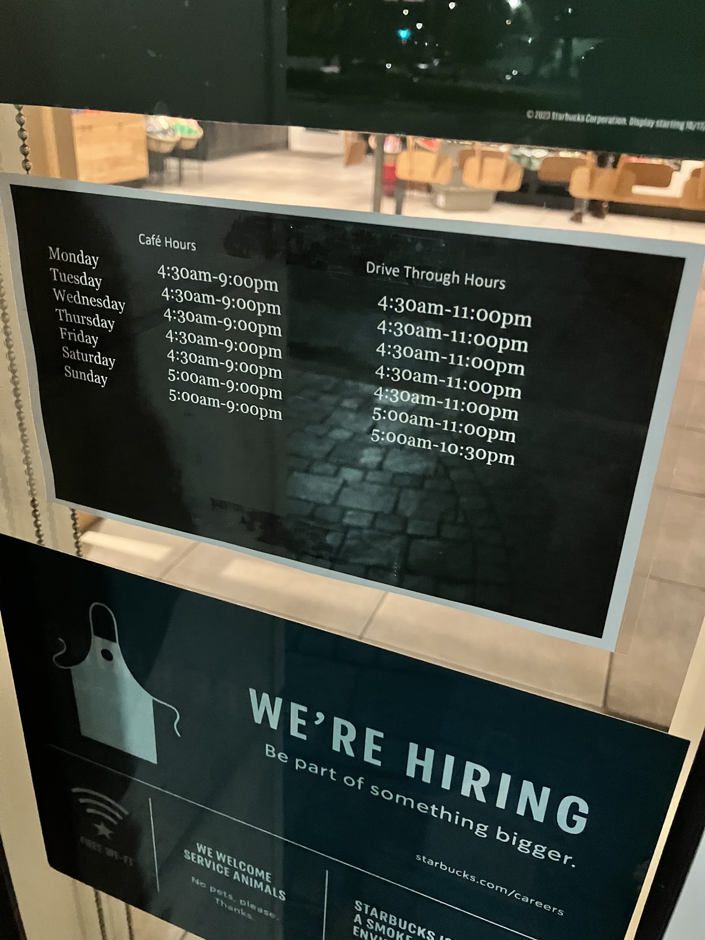 Read moreI was here last week at around 4:45am (they open at 4:30am; see attached photo with posted hours) after charging my car at the Supercharger station. The door was locked but the staff let me in and apologized profusely and allowed me to order.