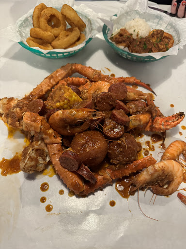 Read moreMy fiancée and I were visiting from Vancouver, BC and I am a seafood fanatic, so I was stoked to see a crab boil restaurant near our hotel. I was surprised to find out that the Alaskan king crab was fairly reasonably priced at between $74-95 per lb I believe? Because the crab serving can be a bit over 1 lb it can cost a little more than the price quoted but I believe my serving was around 8 $80 something dollars and then I added a half lb of shrimp and potatoes, corn, and sausage. I did the mild mix of the whole sha bang and it was fantastic! The seasoning complemented the seafood very nicely and was something different than just butter which was nice. The sausage was great and the red potatoes were good as well the only disappointment was I didn’t understand that the corn order is only about a third of a cob so I definitely would’ve order at least 2 more as it was amazing with the seasoning! The shrimp was also really good for peel and eats and yes, I was covered in sauce and swears by the end of our meal. My fiancée had the onion rings and fried prawns and they were also nice fried items, though the breading was also Cajun tasting which we enjoyed but was a bit surprising as we were expecting a regular breading on the rings. We each had a drink and the bill was under $200 with tip, which I thought was pretty good. The Alaskan king crab was not outstanding, but it was a good option as they were out of Dungeness and snow crab which I usually prefer ordering when on the west coast. The service was outstanding, especially with the restaurant being packed around 8pm with football playing. I wish I could remember the hostess’ and servers name as they were both amazing and very accommodating. The manager also stopped by once just to check in on us and make sure we were taking care of. I was super impressed with the staff and ambience, I would just say I have had a lot of amazing seafood and this was just good...