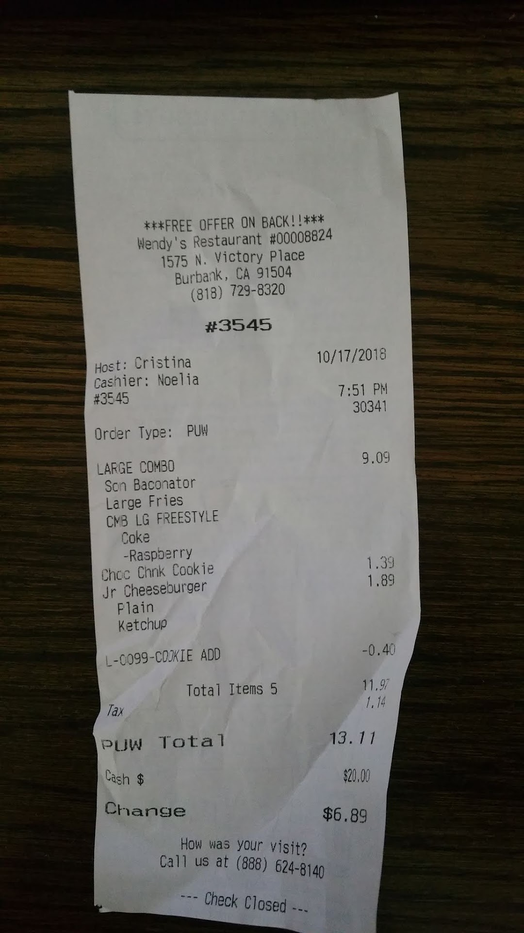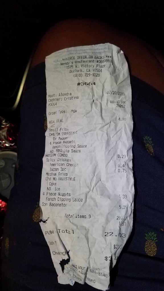 Read more2024.09-28/SAT_1930: Not the brightest staff at this Wendy's. We were picking up a take away order and asked for ketchup because we didn't get ketchup or spoons for our Frosty's. The staff attendant (she) said there was ketchup over there by the soda machine but there were black 2 oz. souffle cups without lids. We wouldn't have asked you for packets of ketchup for our take away order if there were lids to the souffle cups sitting there to get ketchup, wouldn't you think?!! She gave us four packets of ketchup for a large combo meal. They weren't even busy. She didn't have any common sense. We ordered two large Frosty's and one was filled to the top and the other wasn't. Did two different people make the Frosty's?! It was just ridiculous. Crazy how they're paying $20/hour for brainless people to work there. We didn't even have to talk to anyone to give them our order. We ordered it at a "kiosk". They made the Baconator look so big in the picture but when we got it, we thought it was small. It made us wonder what the Son of a Baconator looked like if this were the bigger burger. Other than that, it was decent priced. Smaller portions means cheaper prices. It's no wonder we stopped eating fast food a long time ago. We didn't feel like cooking tonight and wanted a snack. Glad it didn't cost us $40. It cost us $26 for a Baconator Combo and two large Frosty's. The fries tasted like they were using the same fryer oil for spicy chicken nuggets, too because the fries were not completely golden brown and had a hint of spice to them. They weren't like we remembered ten years ago. For a quick snack, it's good to order and eat it there. That's why we started snacking on the fries the minute we got to the car, to get that nice, golden brown, crispy fry. Not here, I guess. Like I said, they weren't busy. No long line in the drive thru and maybe six orders tops and two Uber orders. Nice POS system but the staff had no sense of urgency. I guess if you're allowed to get away with it for $20/hour, why not, that was the sad part. It shows. We should've just went to Krispy Kreme and got dessert there for our snack. That would've been "hot and fresh". At this Wendy's, you won't get that here....