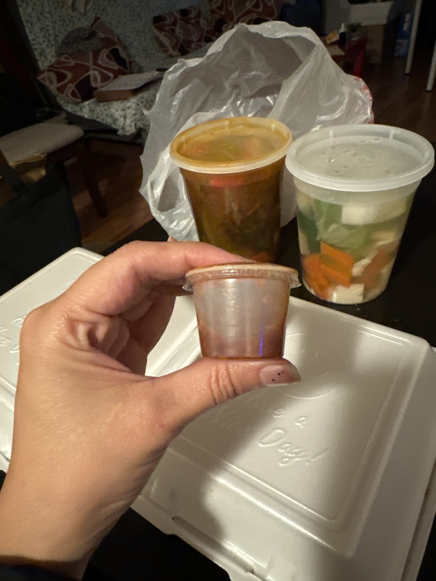 Food is horrible and the worst service ever! They don't even put napkins or utensils to go! Worst restaurant I've ever been to! The 17. Spicy Thai Seafood Soup tasted like leftover overcooked vegetables! It tasted and looked like leftovers (look at pictures)! Vegetables and broccoli where old, soggy and overcooked & there was literally no Seafood in the so called "spicy Thai seafood soup", the only seafood is that little piece of fish u see in the picture and imitation crab!