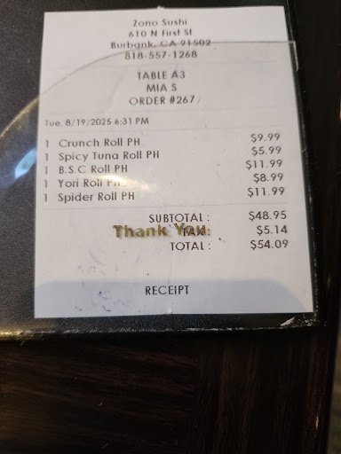 Read moreI really liked this place. It seems to be a local favorite. We were there on a Wednesday around 6:00 p.m. Lots of people were coming in for takeout orders and several people were dining in for happy hour specials. I spoke to a customer picking up takeout and they said they'd been going there for sushi for 10 years. The night we ate there there was only one waitress. We were told it would be a 20 minute wait. We ended up waiting less. The understaffing did cause a drawback in the neatness of the tables. Which is why I'm giving it 4 stars instead of five. Our table was cleared of dishes but I didn't see anyone wipe it down. 😕 Still, the service was good and the food was great and more importantly, tasted fresh! We ordered a crunchy roll, spider roll, spicy tuna roll, salmon poke roll, and the langostinos roll. Our top three favs were the spicy tuna, the langostinos, and the salmon poke. Overall this was a good place for fresh tasting sushi in the Burbank area and we will keep this one on our list for the next time we're...