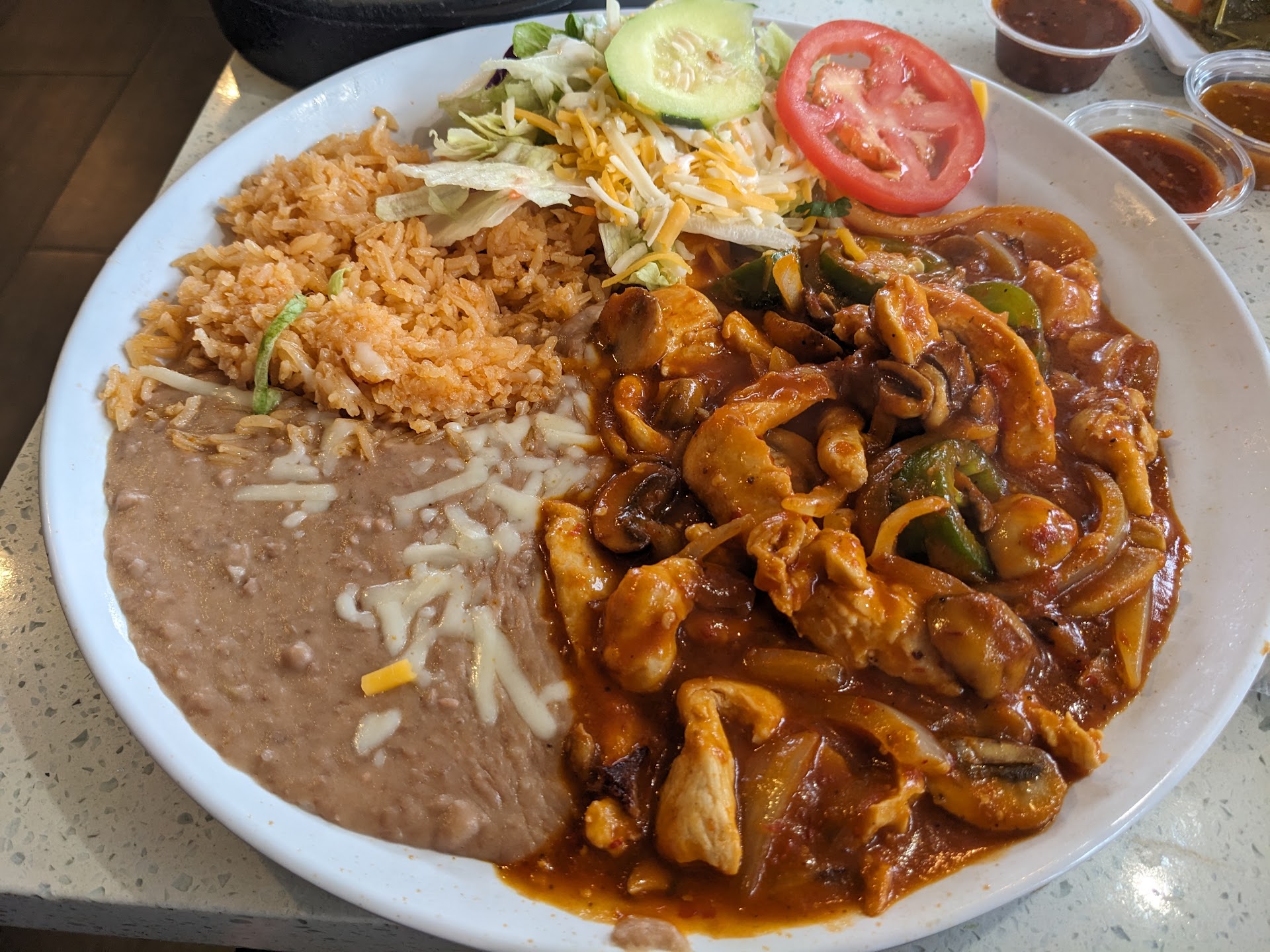 Read moreThis place is extremely busy- obviously they are serving up good food. I ordered a pozole, 2 chicken tacos and a slice of cheesecake. This pozole was delicious(it has pig feet, which I’m not a fan of so I didn’t eat them) the 3crunchy potato tacos that come with the pozole were cooked to perfection and even made me feel nostalgic because one of my close friends used to make these as well when she made pozole and she was only person I ever met that made those. The chicken tacos were for my son- he’s pretty basic. My only complaint is the cheesecake- I’m a cake lover and I was super disappointed with it. It was completely dried out and it tasted like it was left in the walk in cooler without being covered for days, I took one bite and tossed it out (y’all can’t be serving disappointment for dessert- you want costumers to have a completely delicious meal) The condiments should be changed a bit as they add chili flakes to them and not everyone is a fan of those- maybe put the chili flakes inside the disposable sauce container- not mix it with the rest of the condiments. Overall this place has good food and fast services. Planning another trip but not ordering the cheesecake- maybe I’ll try the...