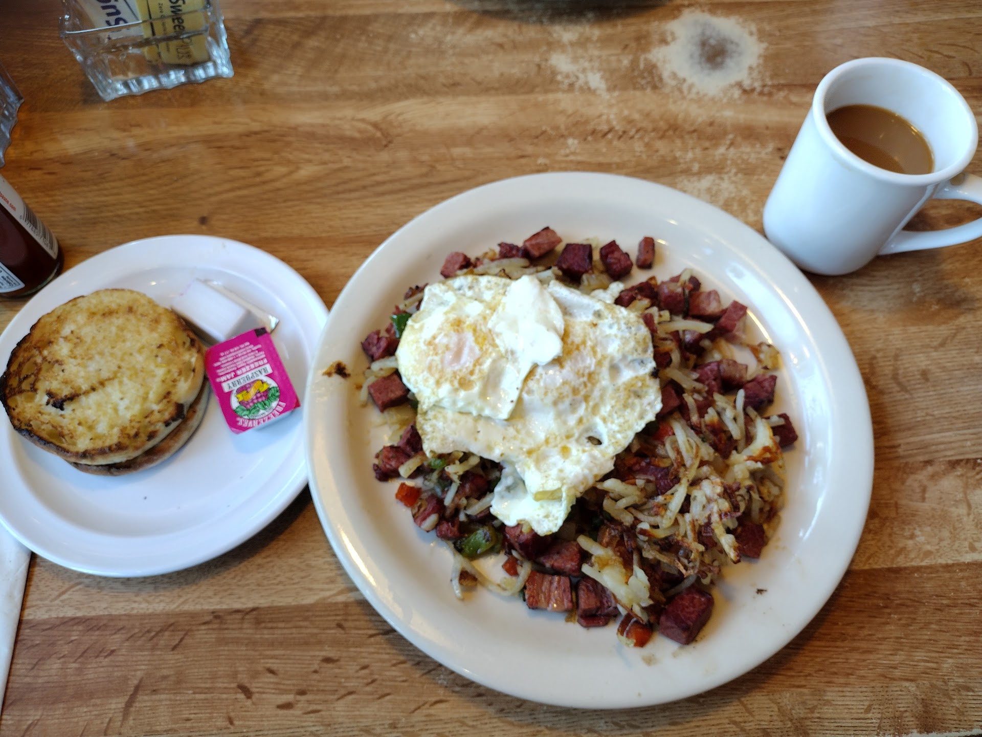 Read moreThe service is quick and polite here at Huckleberry Square. I have seen this place many times as I drove through burien and have even passed it up for another place down the road from it, that I found out no longer exists. Well, what a gem of a place, nothing beats a good restaurant with a consistent menu. Food was reasonably priced for a very nice portion. All the food was well seasoned and salted, eggs were cooked perfectly. The crowd seemed a bit on the older side, maybe it's the day/time and mostly white, which I thought was a bit strange as Burien has a pretty diverse community. Then again I lived in the area for a while and never went so, maybe we need to get the word out to the brown community. I feel like I'm the one that missed out. If you are looking for American faire, that is done fresh and correct, this is the spot. If I or someone I know has a craving for American food, I will not hesitate to suggest Huckleberry Square. I need to come back and experience dinner, because I was also under the misconception that it was just a breakfast place. And it's not, they have sandwiches, burgers, and I watched their fried chicken go past with a server to another table and it looked delicious. I've also seen images of prime rib, and I know they also do steaks. I would say they are a no frills, fresh ingredients turned into high quality diner food. Nostalgic, cozy surroundings, and in old school diner fashion they even sell a bunch of Huckleberry themed items. Which I'm sure are also, of reliable quality. Great experience...