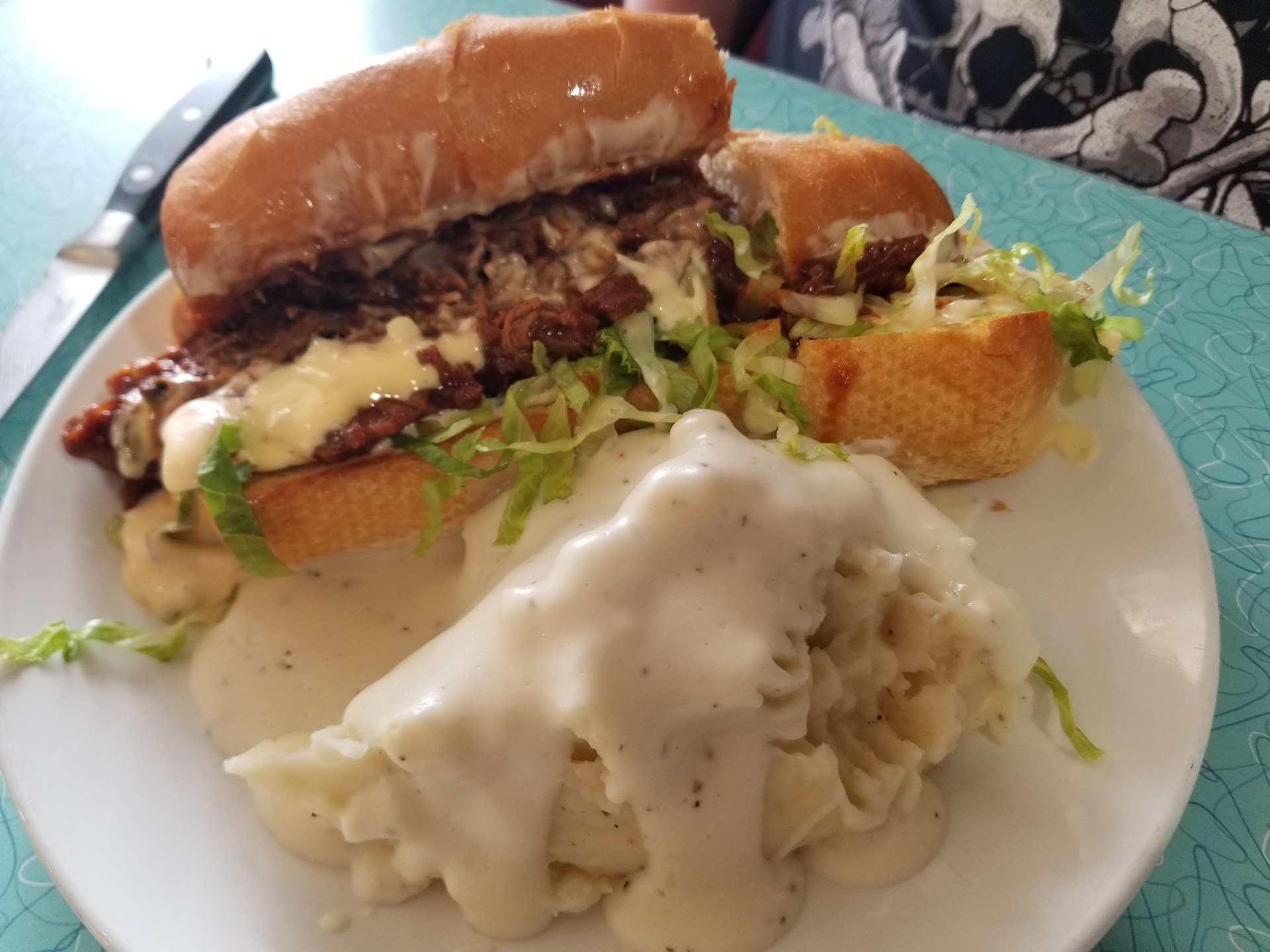 We had fried green tomatoes, a brisket sandwich, catfish with mashed potatoes and fried okra and a thick slice of cornbread. The cornmeal crust on the tomatoes and catfish was perfectly cooked: evenly coated, crunchy and not too salty. The okra was made from fresh, cut thick and perfectly cooked in a light crispy batter. The mashed potatoes were simply the best I've ever been served in any restaurant, anywhere, and the white cream gravy was perfection. The brisket was tender and the sandwich itself was enormous. Even the cornbread was incredible, dense and sweet and practically melting in your mouth.
