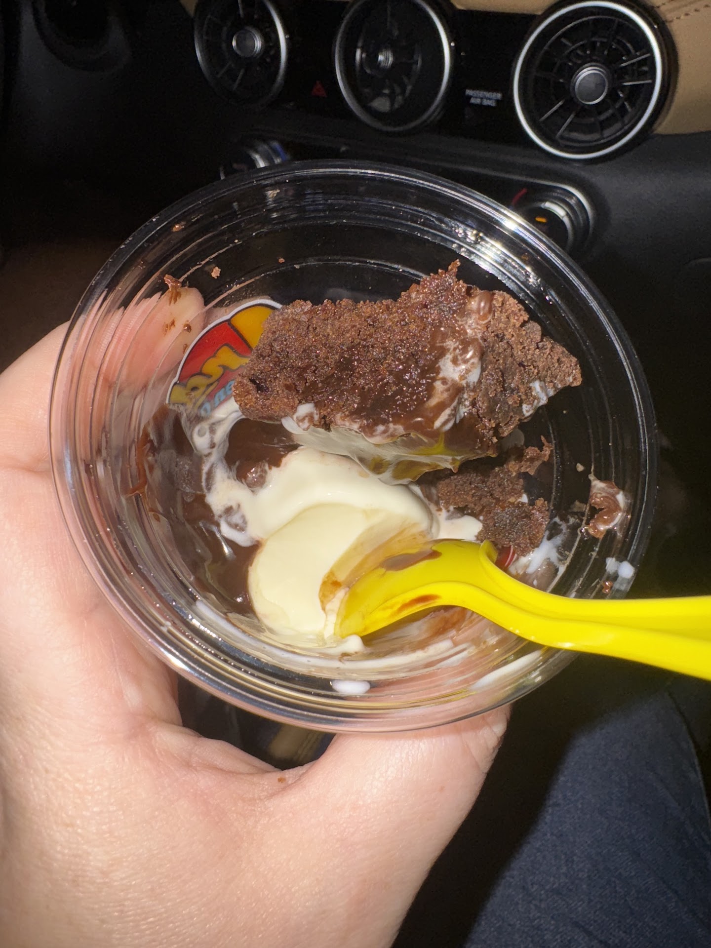 I ordered a kids sundae with hot fudge and brownie. When I got the cup there was hardly any ice cream in it. It was like a brownie with a spoonful of ice cream. I asked the girl at the window for a little more ice cream. When she saw the cup she too laughed and said there was no ice cream in it. When she turned to the shift lead/manager he said he would charge us. The girl even told him âyou barely put any ice cream in it.â And he still said no.