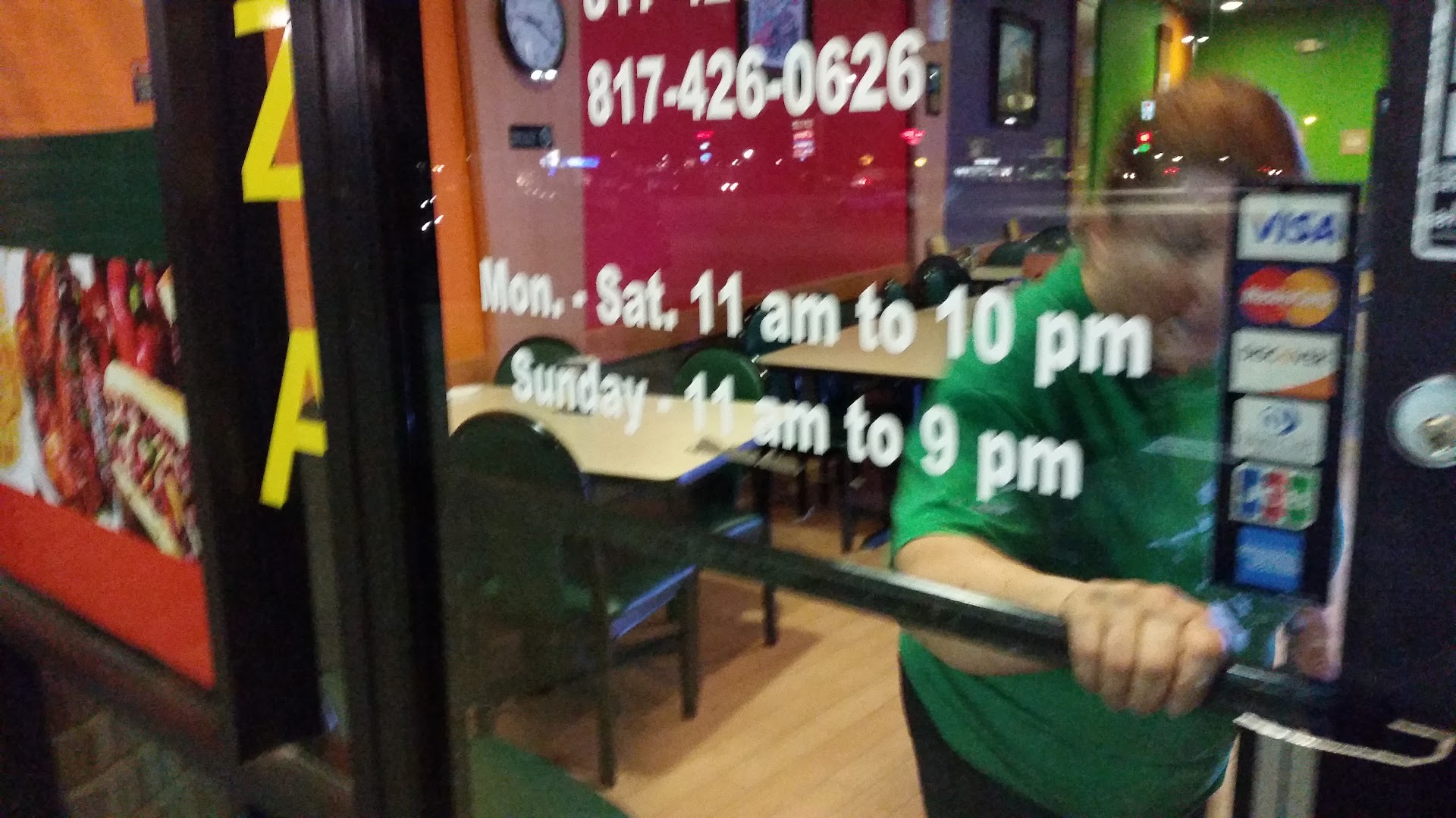 Wish I was leaving a review based on the quality of food but I am not because I didn't get to try it... we literally just left at 9:20. They close at 10 my wife and I walk in and they are cleaning. We are immediately told they are closed. We replied that we thought they were open until 10 that's what the Internet and the door say and they repeated they were closed. I walked out and went to take a picture of the door with my phone and a lady rushed out and said oh we had problems with the gas so we can't cook. Maybe. Maybe not. Because we were not told that up front I'm leaning...