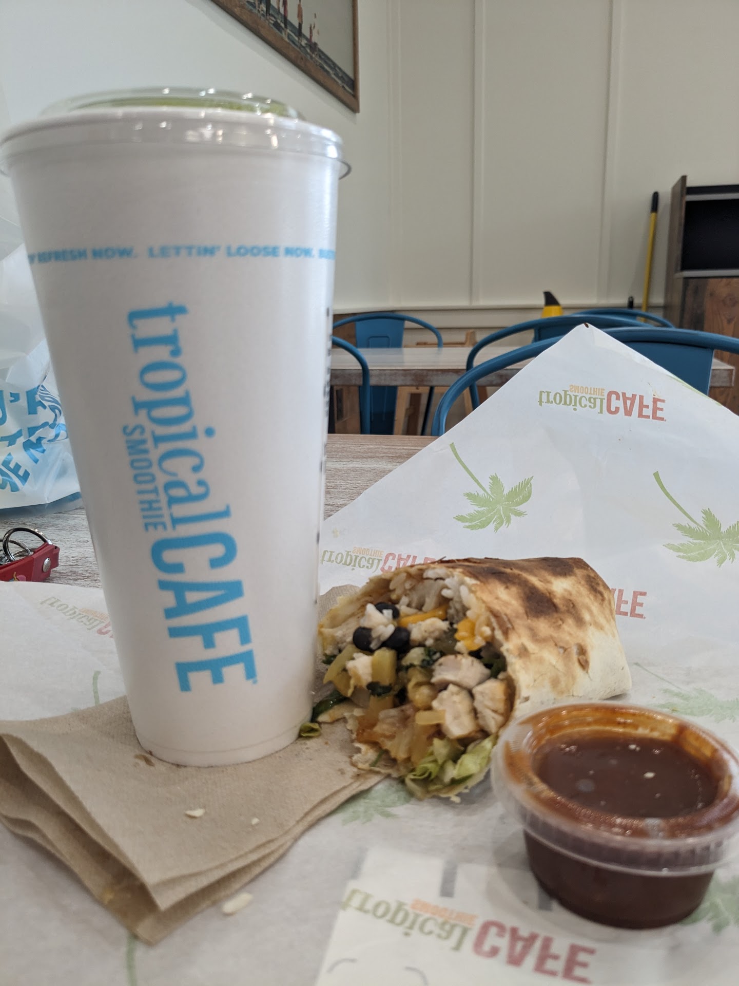 Bahama - bitter taste, obvious. Multiple sip test. Obvious sign of bad fruit. Peanut butter - very watered down with ice, hint of peanut butter. Multiple sip test. Chicken Bacon Ranch - Mediocre. Manager - gave refund for smoothies (which is only items I requested that for, only reason this isn't a 1 star review.)