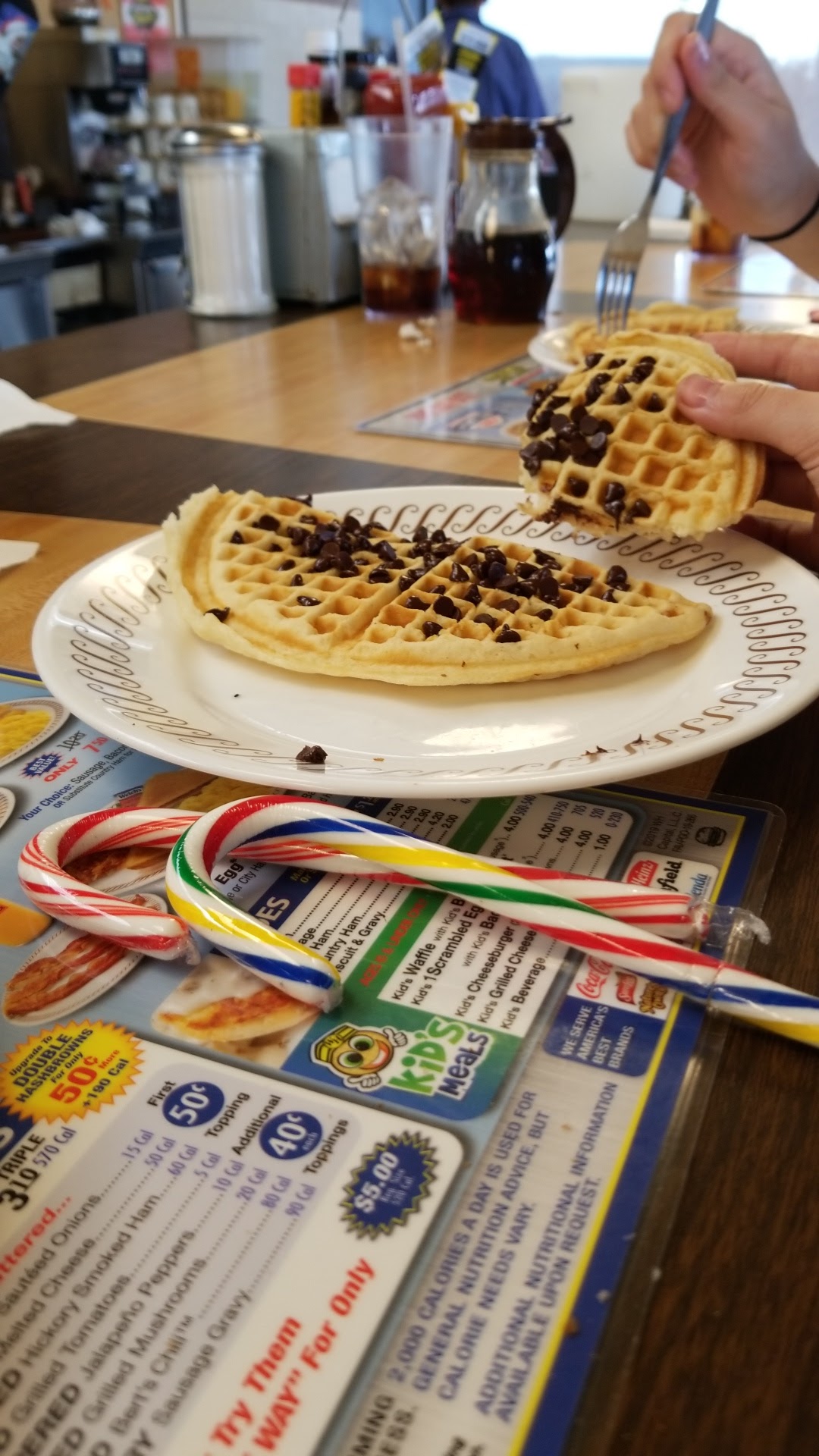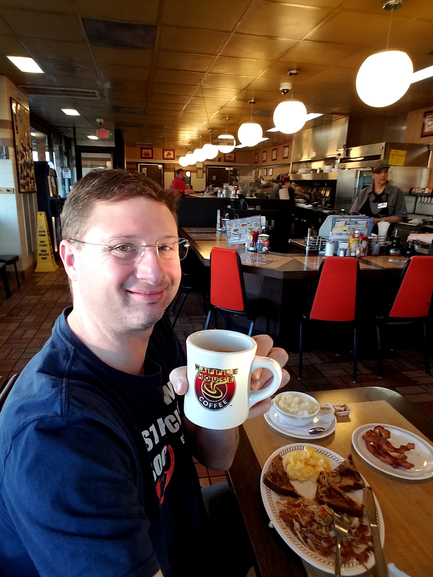 Read moreWe ate there today, opted for that instead of someplace else... should have stuck with first instinct. Coffee pots were so nasty with build up that even the fresh brewed coffee tasted like shoe leather. Our bacon was burnt... black, but still served, like they thought it was acceptable. The hash browns were under cooked and really wet. I had gravy on my hash browns... the gravy was served from a plastic container and plopped on in a glob. My bf asked me not to complain out loud, so I didn't, but he was so disgusted with the coffee that he wanted to call corporate. We were never given menus, we just found some at another seating area. The waiter was polite because he set up our silverware. He must have known the coffee was bad because he never offered us refills. The cook staff had R and B baby making music playing on their external speaker over the grill loud enough for the whole restaurant to be uncomfortable. Thankfully we were just passing through and won't return. Over the years I've learned that Waffle Houses are hit or miss... this...