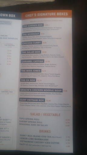 It's always great to see a new place with fairly healthy vegetarian options. Asian Box is yet another build-your-own style order-at-the-counter restaurant. A box consists of a base (jasmine rice, brown rice, chilled rice noodles or Asian salad), protein, toppings and sauce. All boxes also include sauce tossed vegetables.