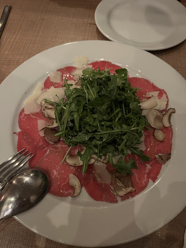 Carpaccio All' Albese - this dish is a bundle of arugula salad sitting atop a plate of VERY thinly sliced beef filet - and the beef is RAW. I actually enjoyed the beef a lot! Filet is super soft and creamy - almost melts in your mouth. The "beef taste" is very subtle and I actually had to try it by itself to really get a taste of it, b/c when I take a bite of everything together, all I taste is parmiagiano and arugula.