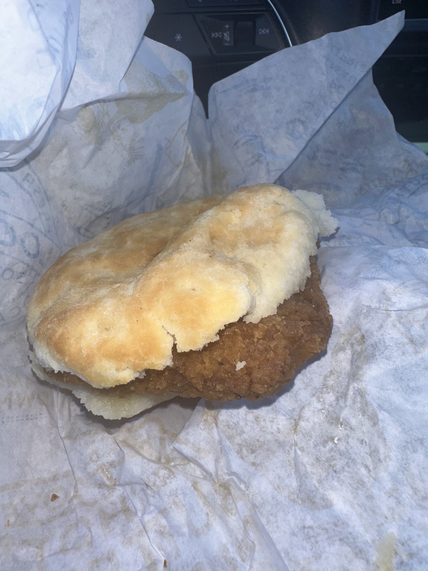 There was a little wait for the food. The fries were overcooked (or recooked) and unsalted. The only thing that helped me eat the fries was ketchup. The biscuit was thin, as if I had gotten a skinny biscuit, which I didn’t. While the chicken was an appropriate temperature, it was thin and not crispy.