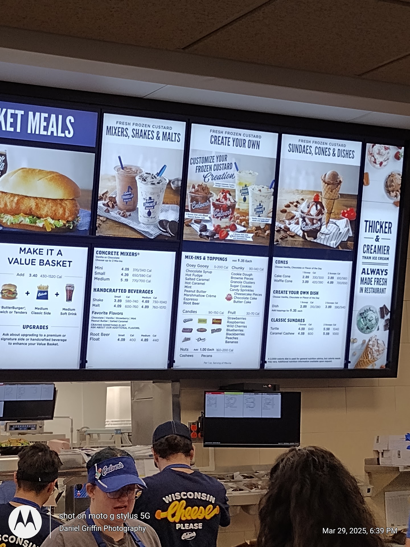 We checked out the New Culver's in Burlington, NC. We heard mixed reviews mainly about wait times...( but the restaurant is new so that should be expected) We went on a Saturday around 12:00ish during the lunch rush. There was no parking open in their lot, so we parked in the lot adjacent (In front of Sir Pizza) Upon entering Culver's, we faintly heard someone say " Welcome to Culver's" we waited in line for about 3-4 minutes before making it to the register. All staff behind the counter were super attentive and helpful to guest ordering , eating in and taking out. The restaurant was super packed. We placed our order and one of the manager asked if we had " Culver's Custard " before we both said no and he gave us a free vanilla/chocolate mixed custard for free. He said , " Enjoy dessert before lunch" We were given our dine in numbered card and cups. Upon going to the drink/condiment station everything was super neat and clean, restaurant was also clean.