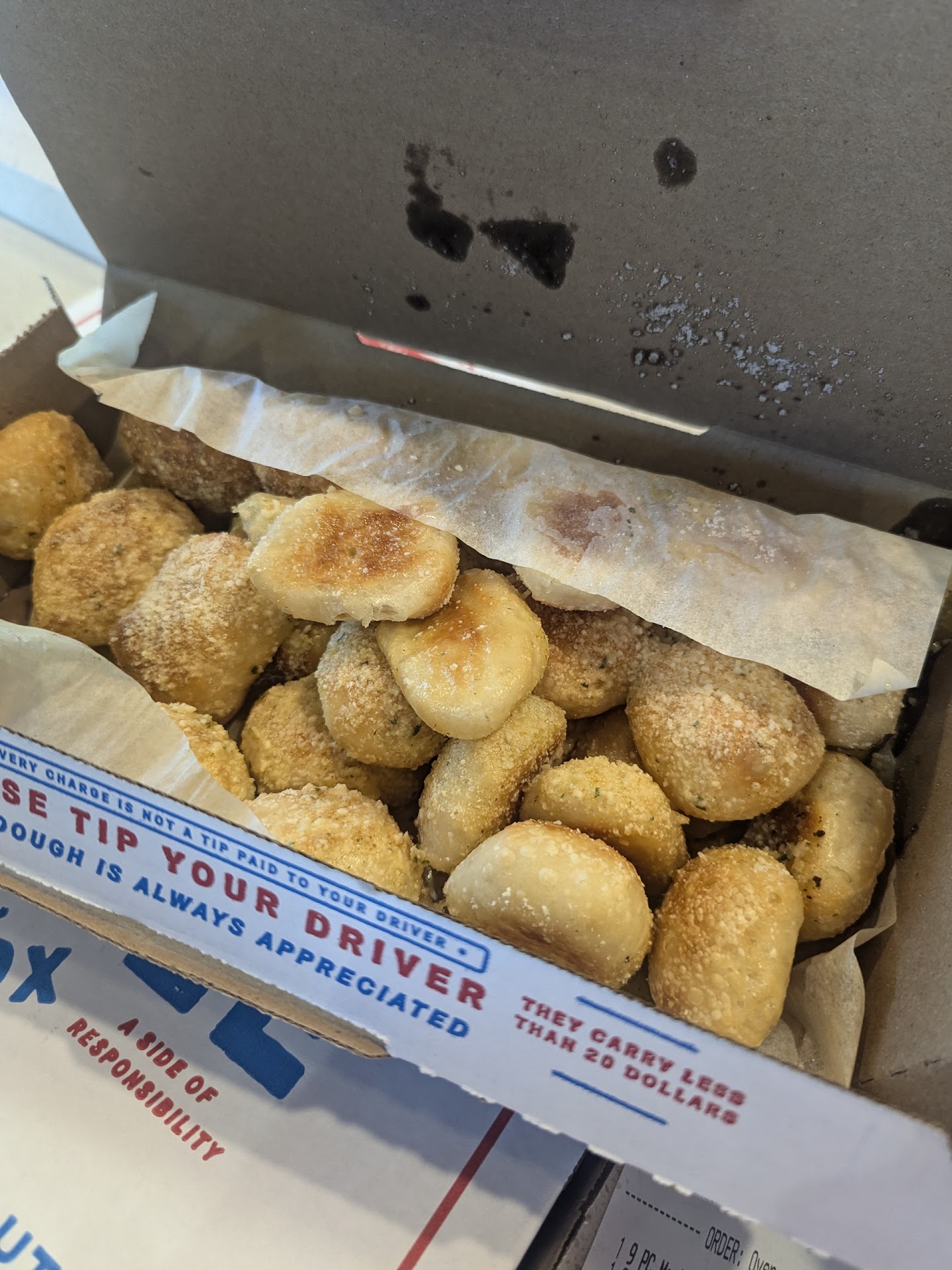 The 1st order was delivered with one pizza having overcooked crust, with no garlic butter crust. Which is sacrilege lol. The other pizza had hardly any tomato sauce. So, it's fine. I called asking them to fix it. Talked to 2 different people, who both cut me off. Which is why the 2nd order is also wrong.