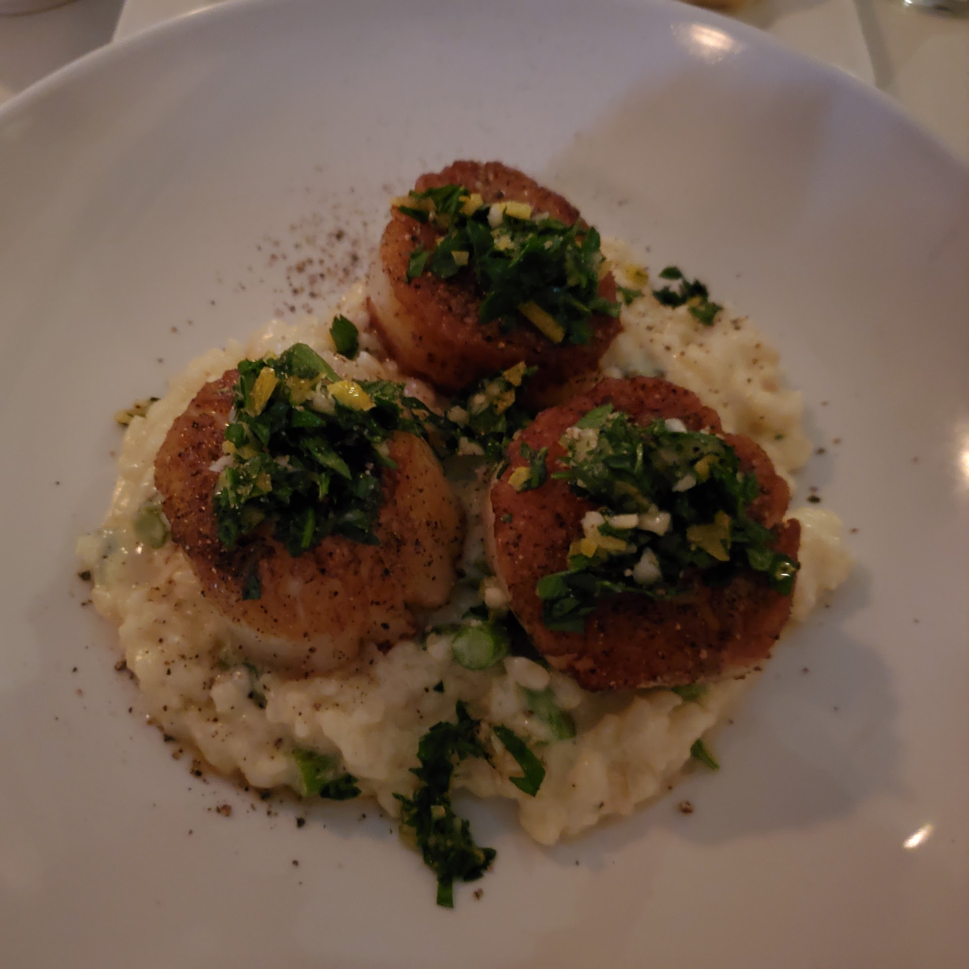 Bride had the filet- cooked perfectly. Came to table hot, as it should. She loved everything but especially appreciated the demiglas (sp?). l had the diver scallops with risotto... oh wow! Scallops cooked perfectly as well. Food came out piping hot. The risotto was the star of this dish though... if I could lick the plate I would have. I will remember that meal for a long time!