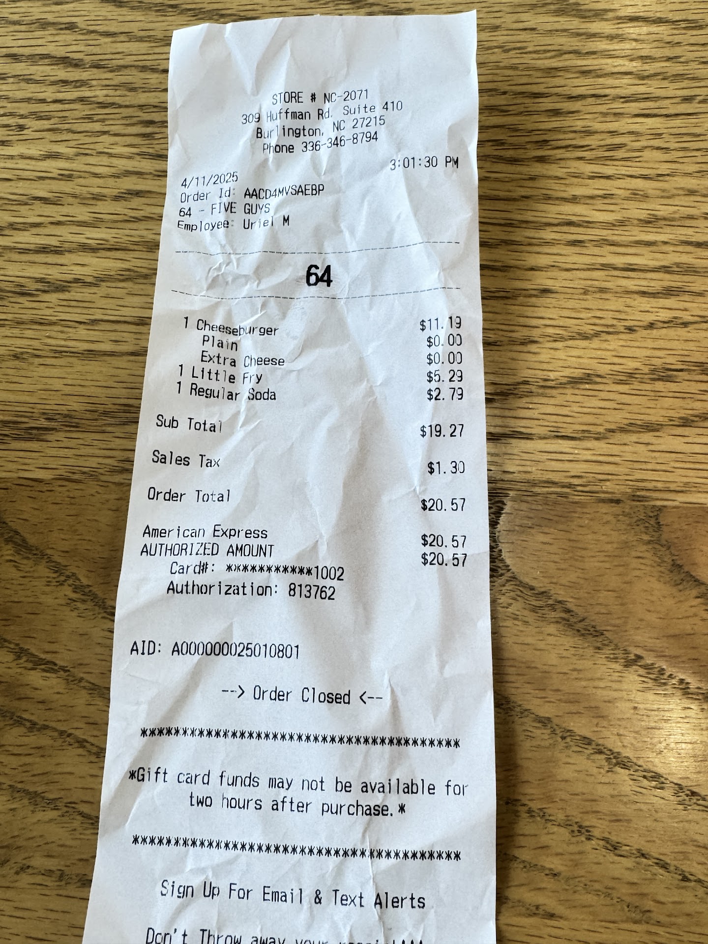 Read moreGiving a High Five to Five Guys in Burlington NC at the Huffman Mill Rd location. Stopped on the way to the airport with my son and husband and wow was I glad we did. I had never eaten at a Five Guys before being from the part of Virginia I'm from there are none around us. First let me give a special shout out to Rebecca and Z and everyone working that day for incredible & friendly service, wonderful food, super clean dine in area. They were all smiling, with professional friendly attitudes delivering 5 star customer service. Great job. If you want fresh made to order burgers exactly how you make it at home with real French fries not frozen, washed down with an amazing milkshake then program this Five Guys location into the GPS and get moving you'll be glad you did no doubt. Thanks for Five Star Food, service and atmosphere Five Guys. Definitely will be back to...