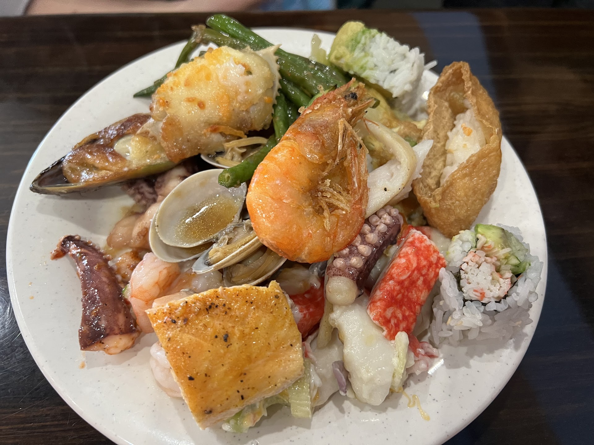 I tried the following: Cold Shrimp Deep fried Shrimp Butterfly Shrimp Stir fried Shrimp Walnut Shrimp Cold Kimchi Shrimp - super spicy if you like heat Seafood Boil Clams with spicy sauce Cold mussels in sweet soy sauce Couple bites of chicken Sushi rolls Oyster Motoyaki Dessert with Soft Serve Ice Cream