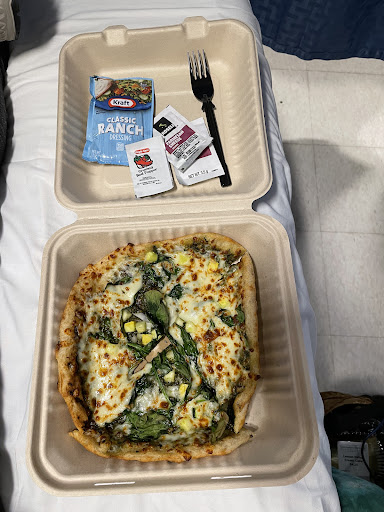 Decent prices. Paid $16 in total for one cup of mushroom barley soup, one personal veggie pizza with pesto, and 2 cake slices (triple layer chocolate mousse; Italian Cream Cake … neither were too sweet). Pizza includes optional packets of red pepper flakes, ranch dressing, and Parmesan cheese.