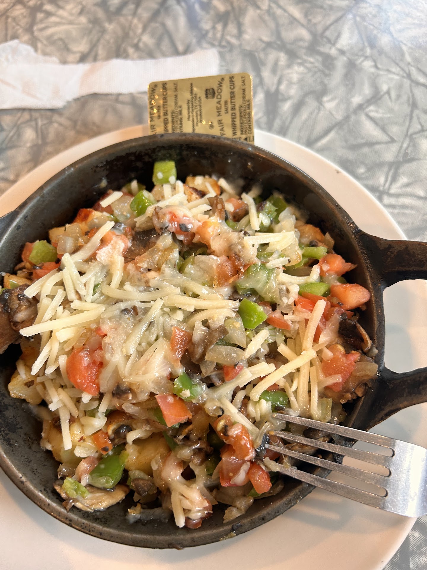 Skillet – 7.3/10 A simple meal with tomato, onion, mushroom, green pepper . The veggies could’ve been cooked more evenly and chopped in similar sizes (some were huge, others tiny). The cheese wasn’t melted and just sat on top. It was something I could easily make at home — and honestly, I’ve made better versions myself. The biscuit on the side was very good but too crumbly for my taste. Loved the whipped butter.