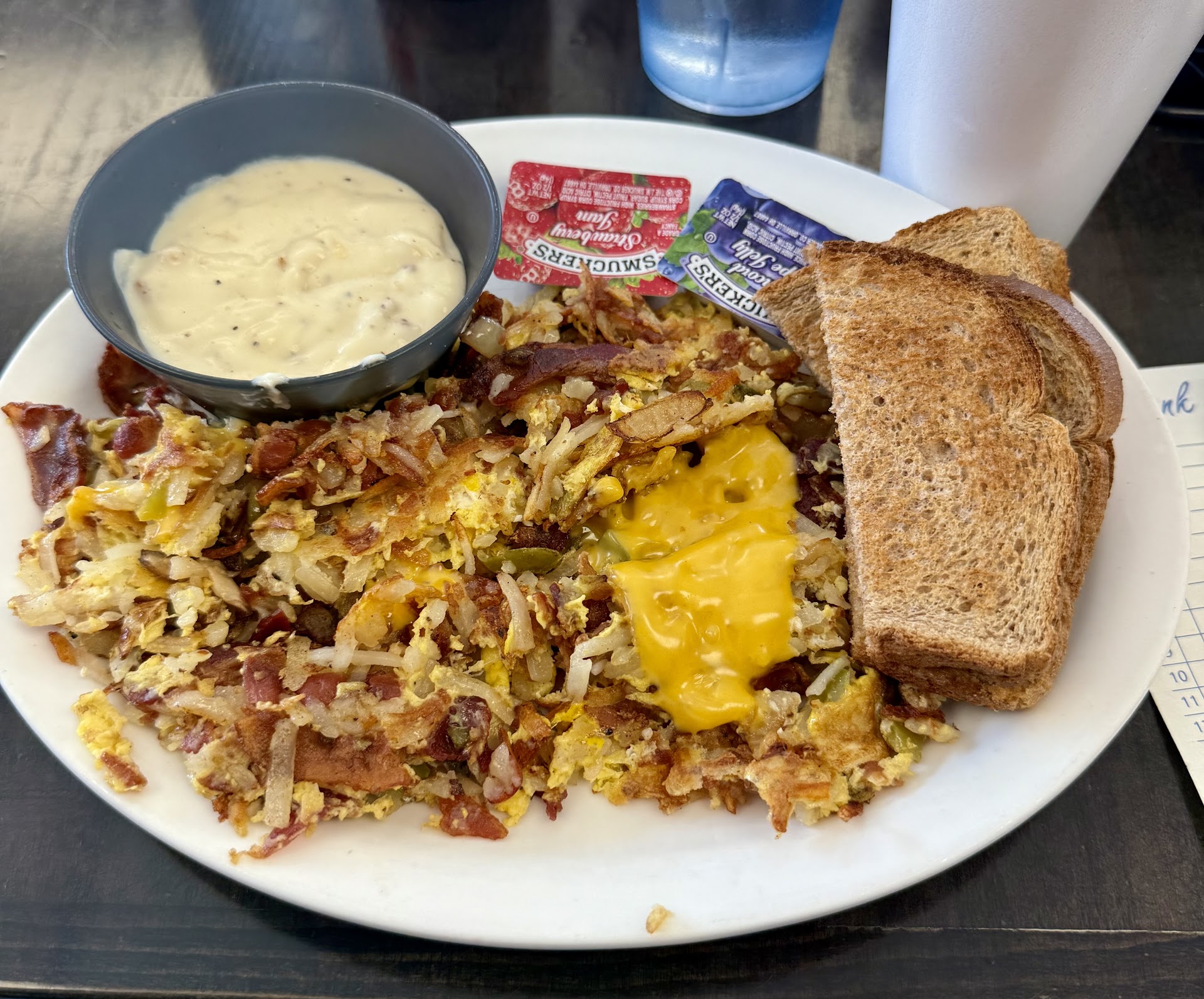 A classic, hearty breakfast that hits all the right taste buds. From the fluffy and buttery biscuits, smothered in rich, homemade sausage gravy, eggs cooked just the way you like them, paired with crispy hash browns that have the perfect golden crunch, youâre bound to start your day off right.