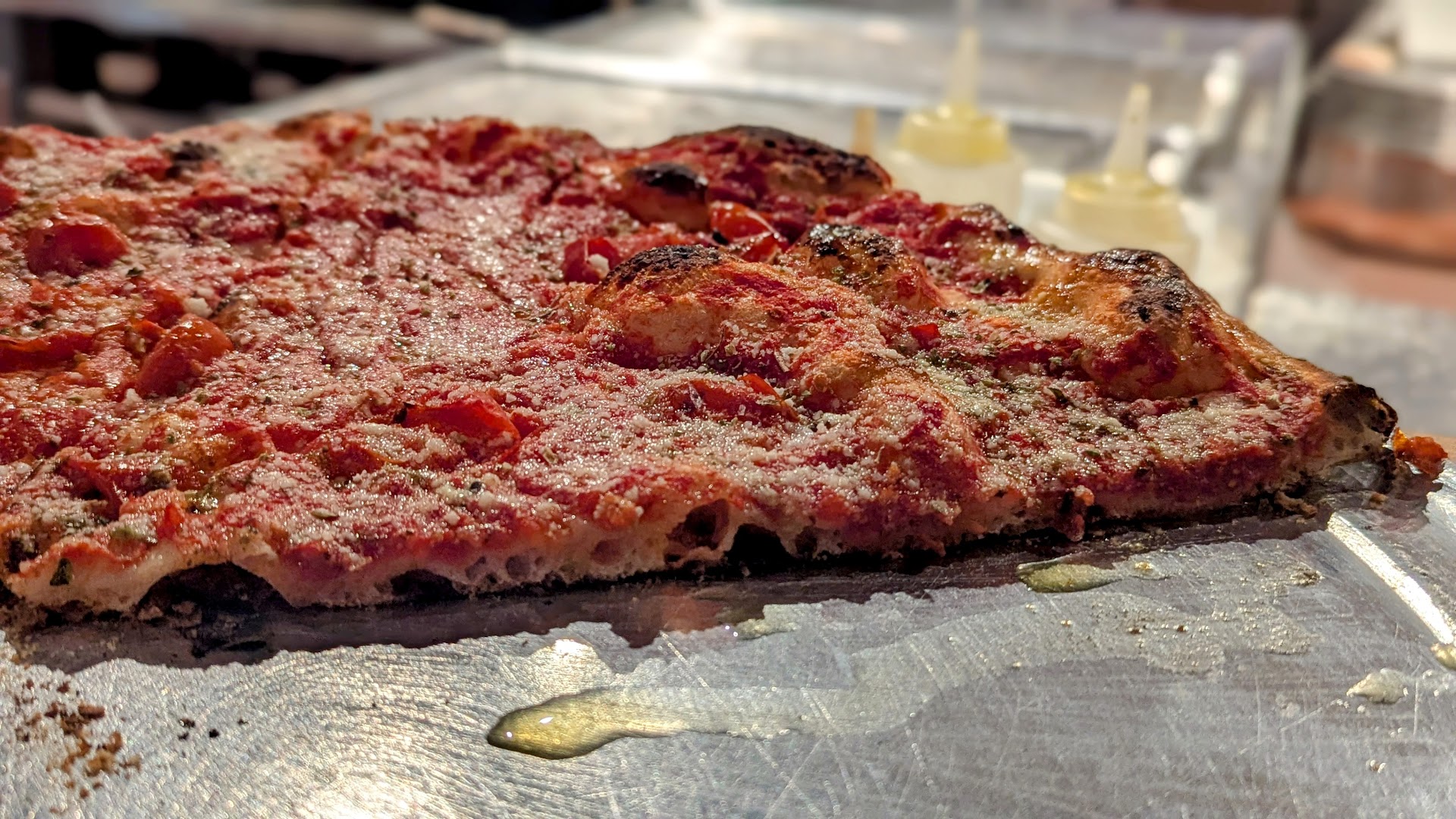 First Time Ordered a square pie to go. With pepperoni. Ordered over the phone, waited about 30min once I got there. Was charged 20% gratuity which I knew about (from many reviews) and I just assumed this was owner's way of discouraging take-out and instead driving people to eat his pizza fresh in the restaurant. So I paid it. We enjoyed the pizza and I felt like I understood the hype. I like square pies and we really enjoyed it. But the high prices and weird gratuity policy made it clear this wasn't going to be somewhere I go without a special occasion.