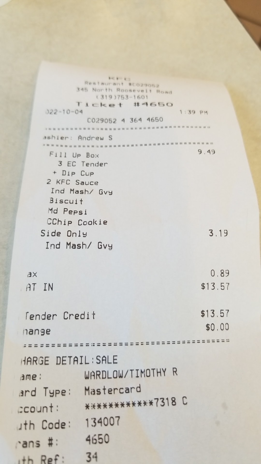 Read moreI absolutely love KFC, when it is done right. I barely frequent this one because it's never consistent, or they run out the main thing... Chicken. However today I decided it has been a while since I had it, so I ordered online at close to 1 for a pick up at 2:15, especially as seeing online that they didn't close until 9. I paid for order and received an email stating that order was not only received but confirmed. I was almost into the parking the lot when I received a call from a young man, whom I assume is the manager telling me he had just received me order at 2 and they close at 2, however he didn't call me untill 2:15. Needless to say I was irritated he never told me why they were closing just that I could get my money back from the app, that I ordered it through. I ordered from KFC online, , he then went on to tell me he doesn't have any money there, and that his online ordering should've been turned off. Horrible...