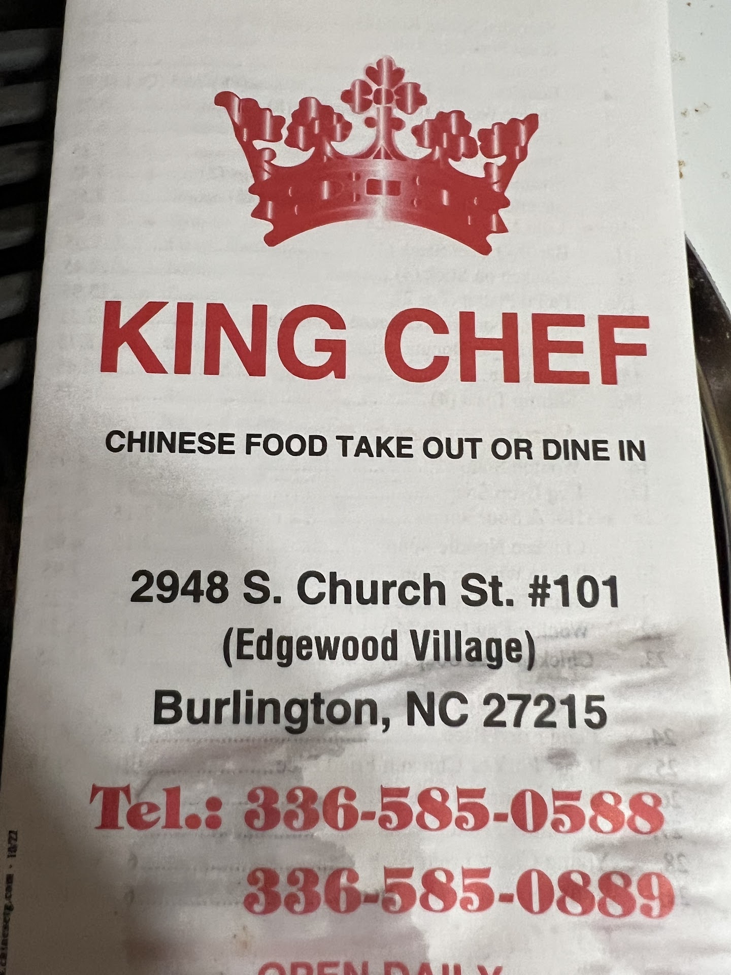 My husband and I are fairly new to Burlington we tried several Chinese restaurants in the area and was not pleased, we came across king chef and my husband really liked it. We get food from there often and have had no problems the last 2 times on 2 different occasions I ordered chicken on a stick the first time it was so over cooked I couldn't eat it, things happen so I just let it go next time we ordered we went into restaurant and we told them what happened first time they didn't seem to care my husband said please don't over cook it the lady there said we not burn it well when I got home it was so tough I didn't eat it.