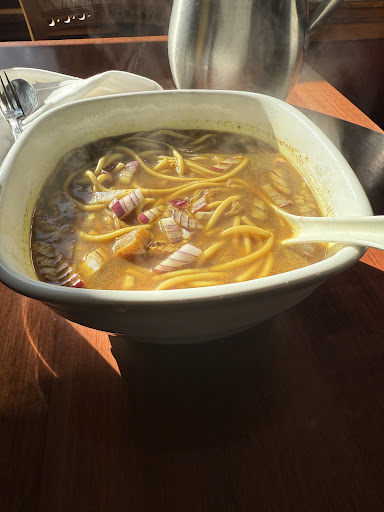 Right as I entered the restaurant, a heavenly smell of Indian spices hit my nose, and it made me feel so good. I got instantly seated, and I ordered a Pork Thukpa, and a Mango Lassi. I can see the city hall from my window. Btw, this is my first time trying Indian food in the USA!