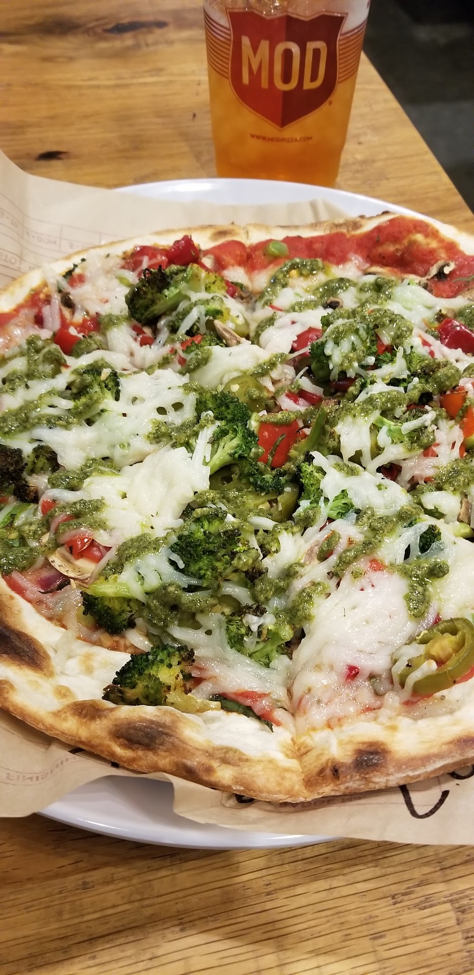 I'm hopelessly addicted to this pizza! I always get the regular crust, red sauce, mozzarella & parmesan, then the rest varies. I don't get the finishing sauce. I'm pretty traditional and it's great having the option to stay traditional or go crazy & get anything you want. The red sauce so flavorful yet light. All the toppings are super fresh. I've never been there when it wasn't busy, which is great. I'm happy to see them succeed! I personally order on my phone, I like that it remembers my info and I can pay when I order, select the time I want to pick it up, then bypass the ordering line and just go to the register & pick up my hot & ready pizza! This location opened in summer, SO cool the way the windows are like garage doors and can roll open like an open air restaurant. Yes it can be a bit loud but it's people enjoying themselves, lots of laughter and good times here. I love how a staff member will yell hello or goodbye to a customer, and the rest follow, so you have a whole cheering section greeting you or sending you off with a smile. MOD is pretty much a weekly event...