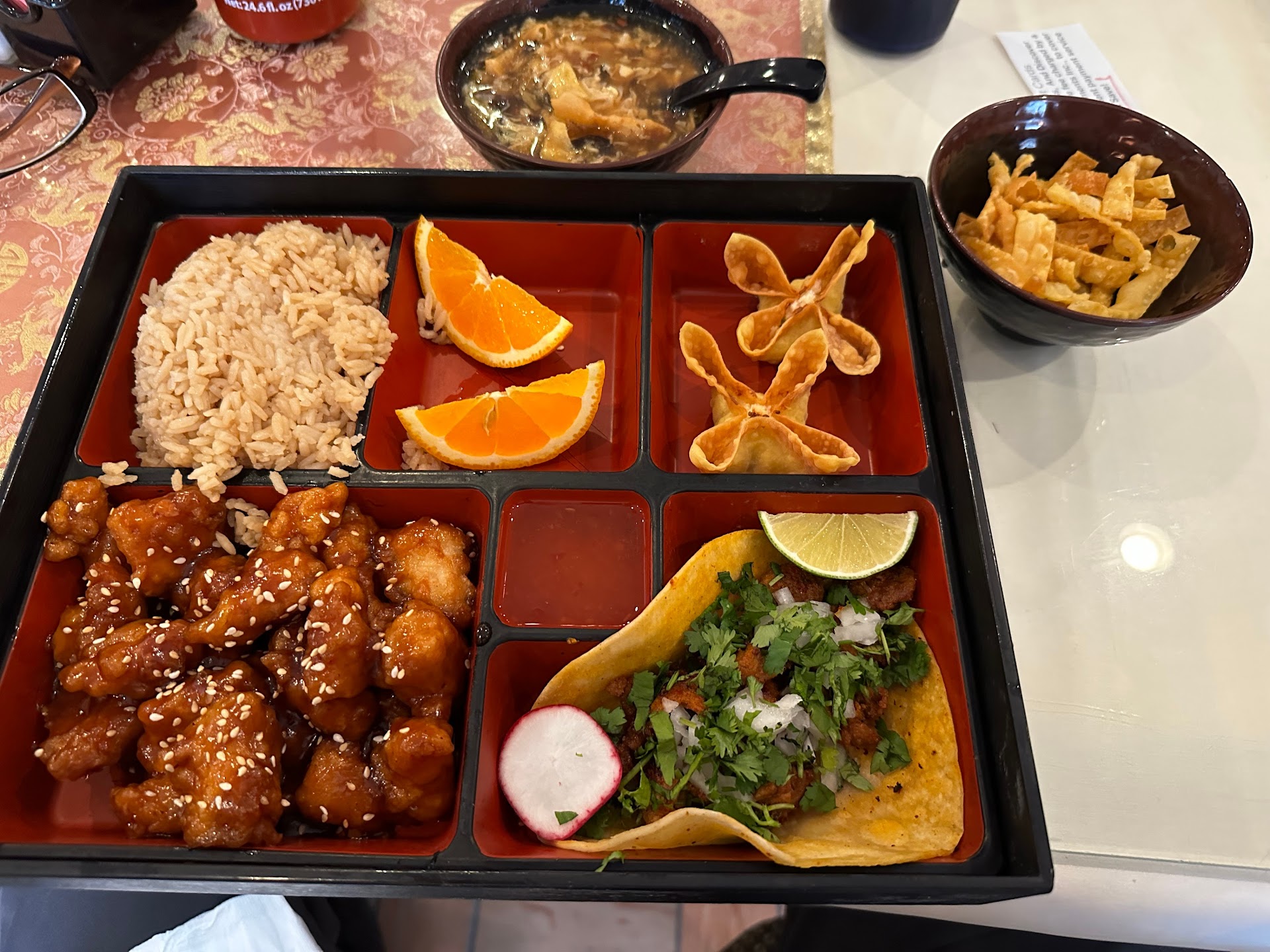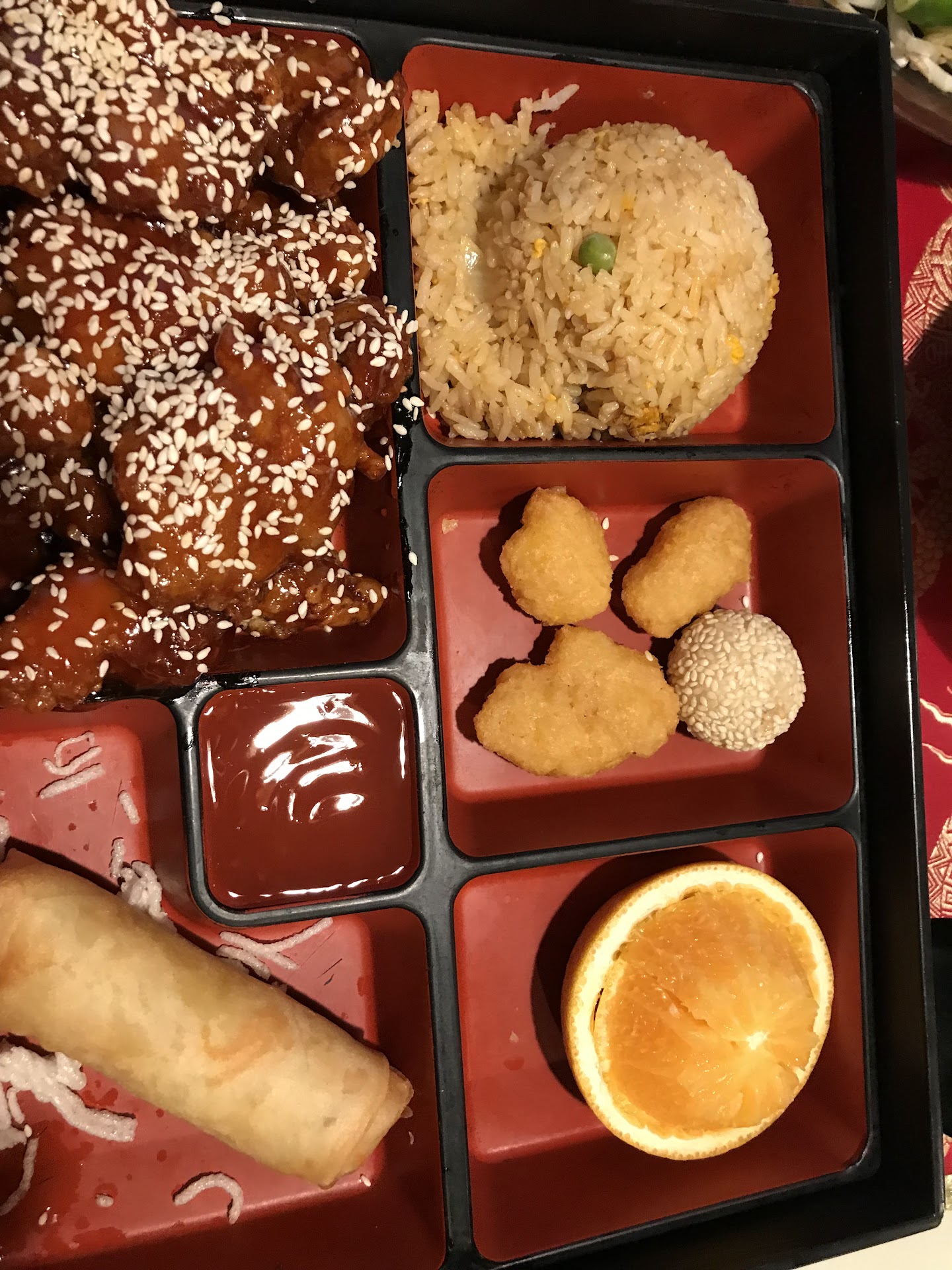 The bento presentation was unexpected and wonderful - clean, efficient and attractive. The halved and quartered orange was a nice surprise that both cleaned the palate and offered a sweet dessert alternative to the standard fortune cookie.