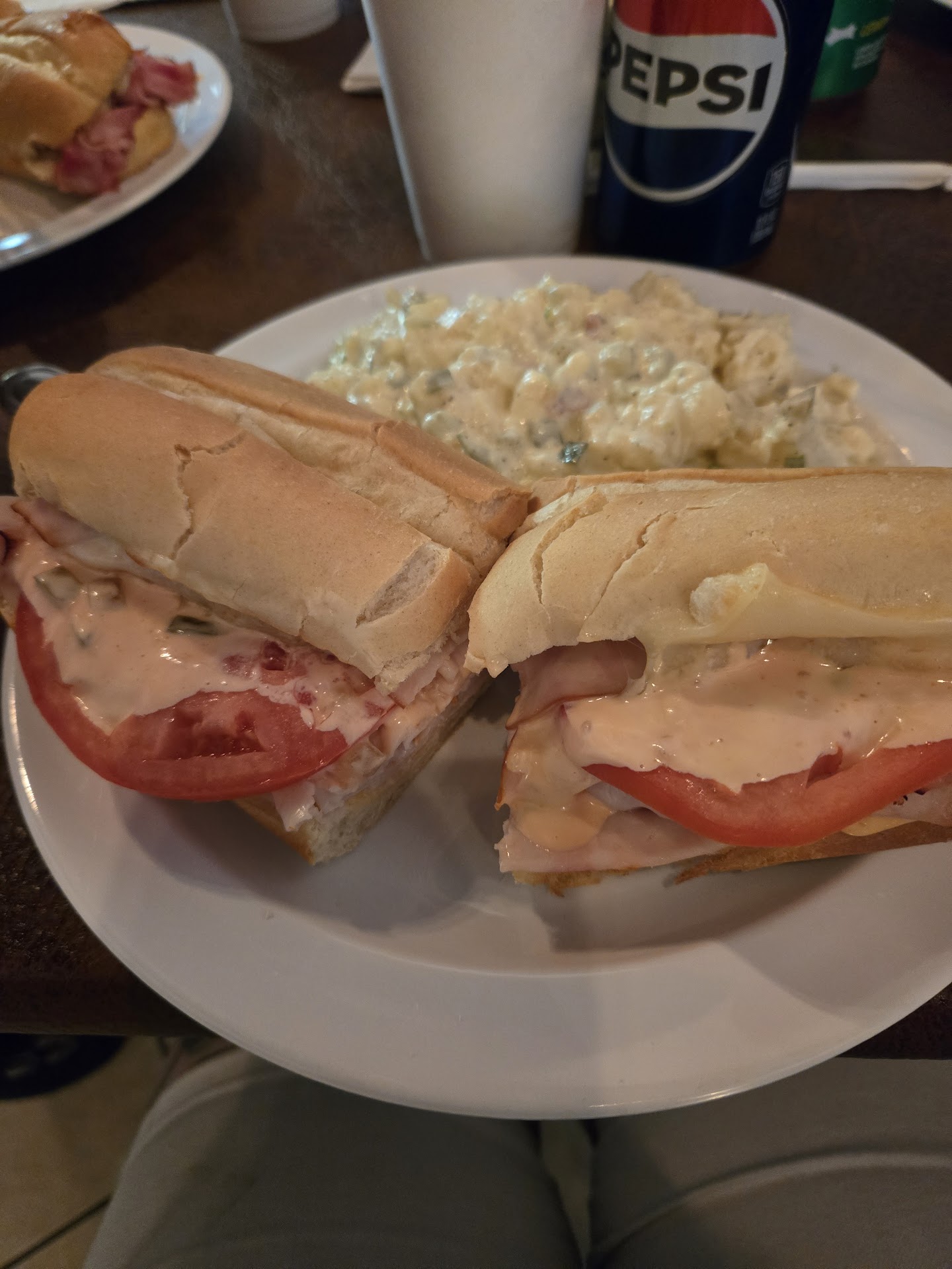 The potato salad was very good. A bit mild (nothing Texas Pete couldn’t fix), though, but it had a delightful texture. The potatoes (red skin) were perfect—not too hard and not too soft—and very tasty.