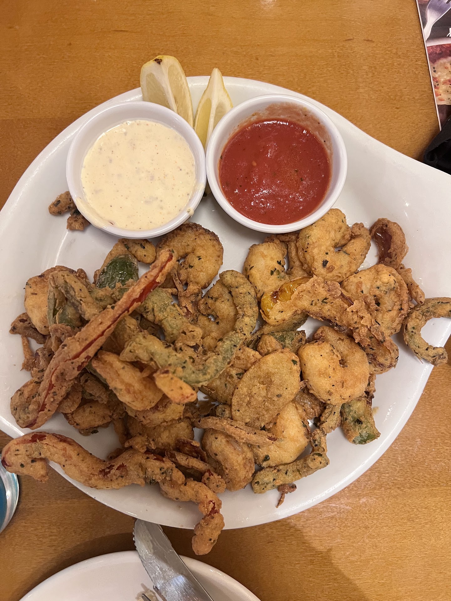 Read moreFathers Day. My adult son and daughter treated me to what we hoped would be a fancy, unique dining experience. The best part of the evening was being seated fairly quickly. After that, the very damp tile floor was the first indication that things may not go as hoped. The room we were placed in might as well have been the dining area of a run down Burger King. For a restaurant that prides itself on having good ambiance, it was too loud, too cramped and too 'busy'. The atmosphere ( the actual air) felt damp. The men's room has disgusting; paper towels overflowing from the trash cans, and strewn throughout the room and on the counters and in the sink. The floor was wet , not only around the urinals but everywhere...even beyond the outside of the door. The counter was covered in large splats of water. The table where we were seated was too narrow and short to hold the large plates. The seats of our booth were uncomfortable and the two of us sitting on one side constantly bumped elbows. We felt stuffed into the place. Our waitress was nice and to a point attentive. When she brought my beer...she passed the table in a hurry, stopping 2 seconds to put a bottle of beer down. No glass. The beer was cold and I don't mind being served with bottles or cans...in some joint that isn't pushing a refined atmosphere. When our two giant bowls of salad and plate of bread sticks arrived they took up most of the table. My daughter and I found human hairs in our salad. We politely showed them to our waitress. She apologized and offered to have new salads made. No thanks. We were then offered free dessert. I didn't even want that but my son and daughter convinced me to to accept the offer. Our meals arrived and the plates were wedged among the water glasses, bread plate, salad bowls, and salad plates. There was nothing special about the spaghetti with meat sauce. I ordered it with sausage. The waitress read it back to me and said, 'with sausage'. It arrived without sausage...since the addition of sausage did not increase the price, I didn't say anything. I and my kids were, by then, just wanting to get a bit of food into our bellies and leave. We needed fresh air and open spaces. A manager came out to apologize for the hair in the salads...and to offer 'A' free dessert to one of us. ONE of us, even though 2 of us had hairs in our salads and the other couldn't enjoy his salad or main entre because of the hair and the uncomfortable surroundings in general. We settled for a small slice of cheesecake...the kids said it was OK. You'll notice that we stayed and ate despite the complaints. However we left behind all the salads and we took three large meals home to our pets. For the prices we paid we would have done better going to any of several real Italian resaurants in the area, getting better food and service in a clean, open atmosphere and paying...