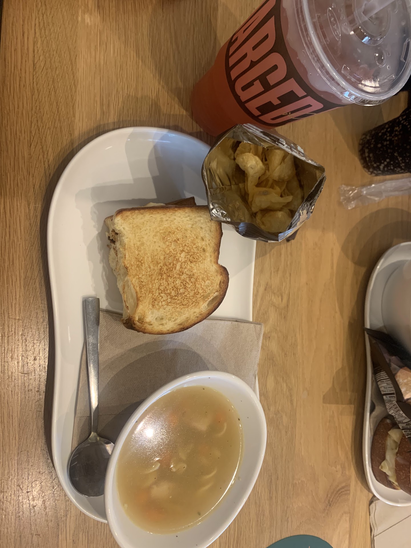 Read moreHave been to other Panera locations before, so I had an idea of what to expect when eating here. The parking was busy because of the Fun City next door, but no big deal. We ordered at the counter because it was quiet when we went in. I settled for a spicy chicken sandwich (was hoping more for a traditional deli item like ham & Swiss on rye), which turned out to be ok. Their soup bowls and variety of salads are tasty if you're in the mood for them. Overall, the service and quality here was good. They also offer a variety of breakfast items and coffee that I will have to...
