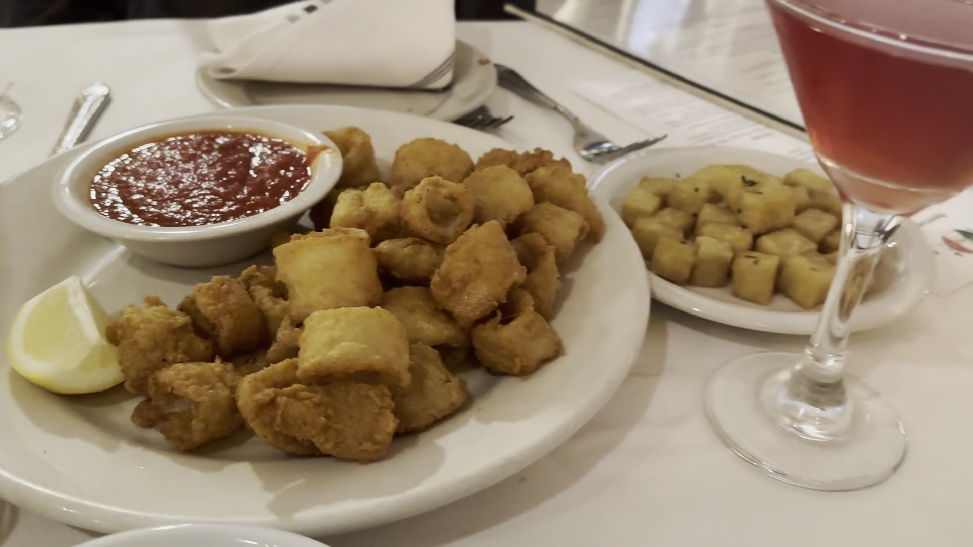 We ordered the calamari to start and it was to DIE for. All of our food came out SOOO quick. Perfectly crispy, lightly breaded and TENDER squid paired so incredibly well with a marinara sauce you could tell was homemade and fresh. They also brought out this little complimentary fried polenta bites that were reminiscent of a well done fried potato bite. They also brought out a simple bread and olive oil (which was ALSO flavorful which is rare in places i’ve been to)