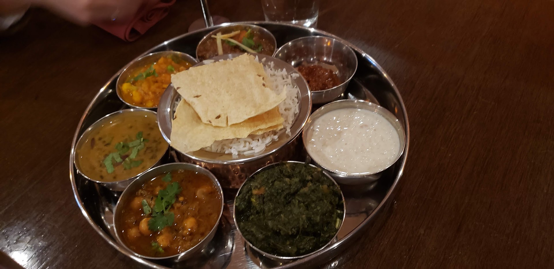 I was out for a walk on Church Street, looking for a place to stop in for a meal, when Dan, one of the owners, came out and greeted me. We had an enjoyable conversation about their food - including their halal meat supplier. His genuine disposition (and the promise of good Indian food!) won me over, and I decided to step in and have dinner. The warm interior decor was roomy and welcoming, the lighting was at just the right brightness for my sensitive eyes, and the eclectic mix of Indian music provided an enjoyable background. I had a difficult time choosing from their wide selection of vegetarian and vegan friendly options, but settled on vegetarian samosas, chana masala and masala tea. The food came out promptly, and I was very pleased both with the presentation and the taste. The samosas (two per plate) were crispy on the outside, coated with a liberal sprinkling of spices, and filled with a flavorful mixture of potatoes and peas. The chana masala came in a fancy dish with a bowl of rice on the side. It was so flavorful I cried! I could not eat it all, but I took it home to finish the next day. I ordered another masala tea to go in place of a dessert :) I would HIGHLY recommend that you come with an appetite - the prices are good and the portions are generous. I cannot stress it enough: do NOT pass up this...