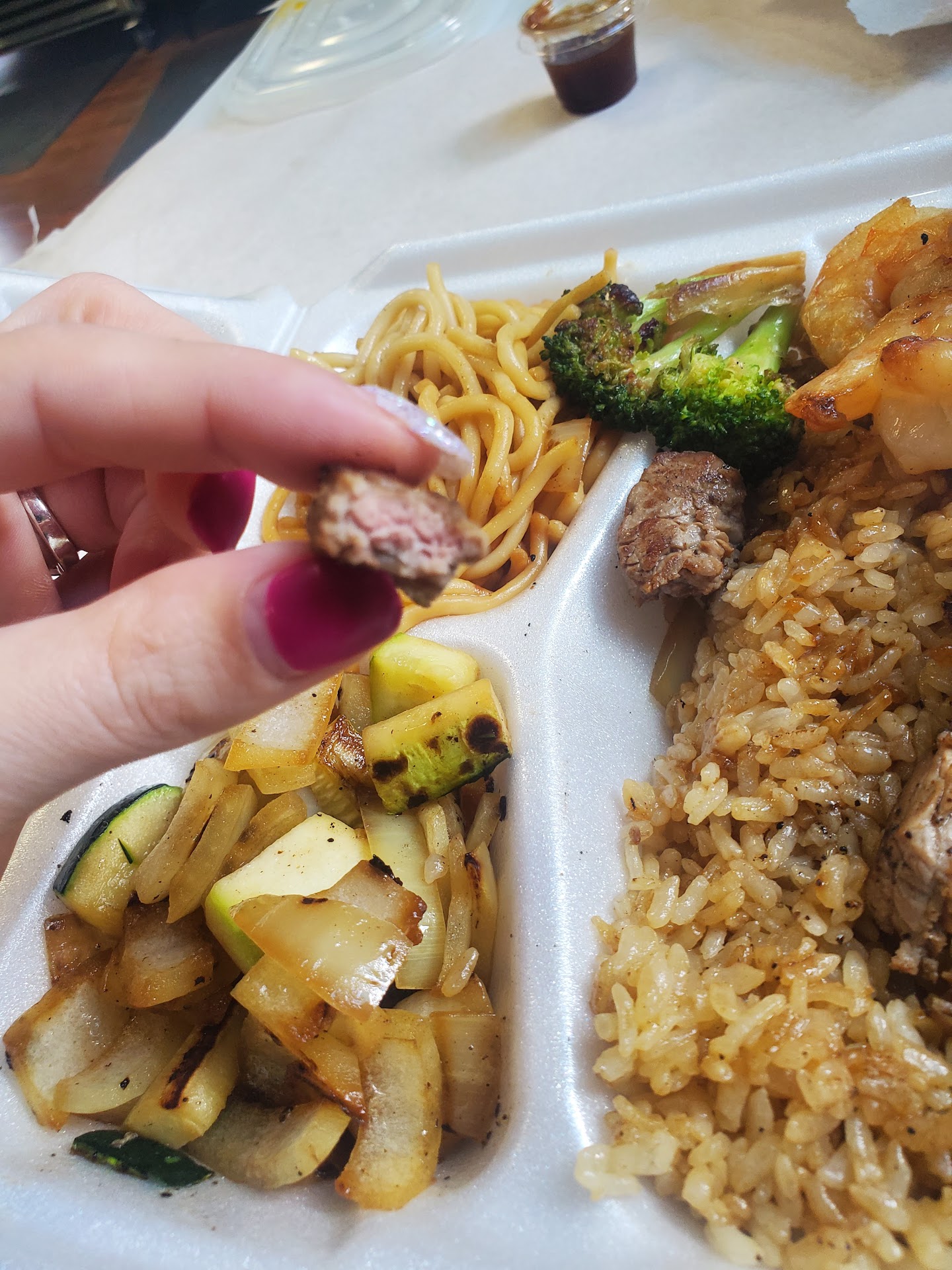 Read moreWorst Japanese food and terrible service. First, I had to call twice; I was put on hold immediately both times. I phoned from inside my work, and my GPS stated a 6-minute drive. I was on hold the entire time, and I walked in still on hold. The girl at the counter gave me a lot of excuses which were all very unprofessional. The place had 2 customers in it - that's it! After waiting 25-minutes for our food, it was of poor quality, if was small amounts, and it was not what we ordered. The Hibachi steak and shrimp wasn't Hibachi at all, just grilled. The Hibachi steak was little tid bits as if you were feeding a child bites or even your pet, and it was cooked medium-well instead of medium-rare. The rice was just steamed rice, no egg, nothing. The vegetables were only onions, and the salad was so chintzy it was pathetic. The Hibachi chicken also ordered was not hibachi, and they were miserly with the chicken. You could tell the food was of cheap and poor quality. They charged me the wrong prices as well. My friend and I will never go back, and I cannot...