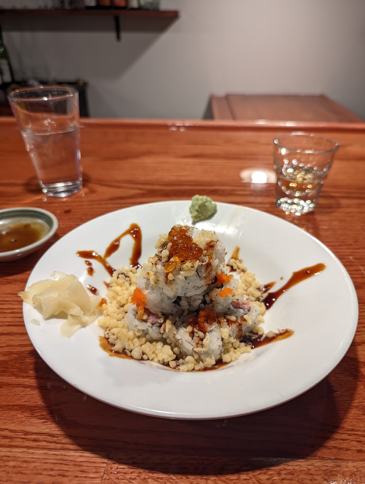 It was around this time that the couple and the man at the bar finished their patronage and left independently of each other. We were the only ones in the entire place. We proceeded to sit at the bar for another 35 minutes without seeing the waitress or any food, with the old man behind the sushi bar just shuffling around in slow motion. It was too far away to know if he was making our food or not. At this point, we got up, threw some cash on the bar for the sake we had consumed, and walked out.