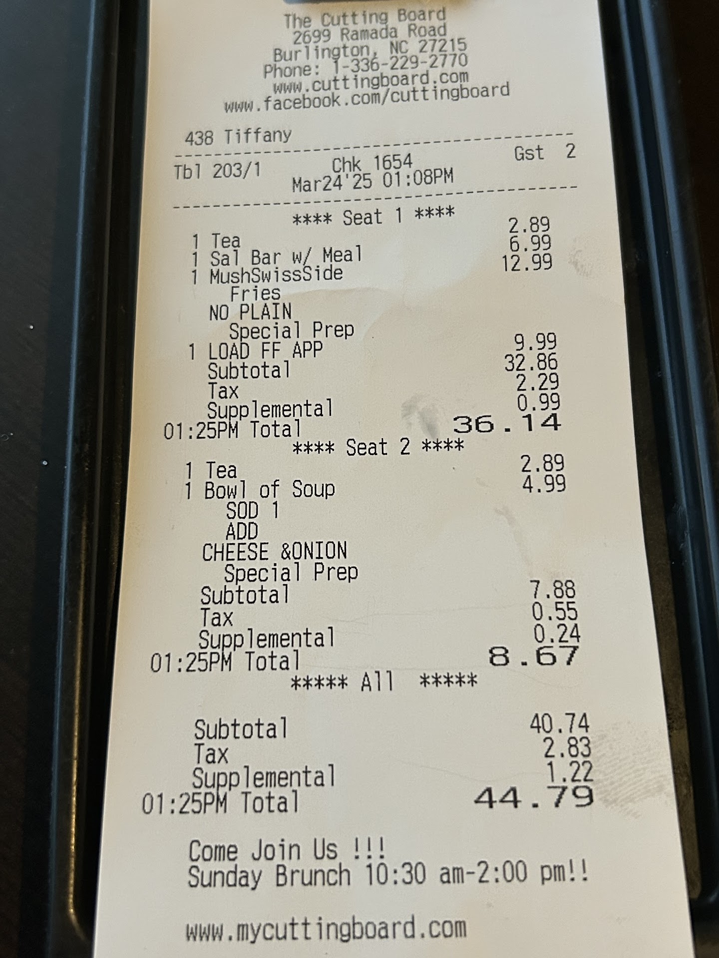My family a party at 6 all met at The Cutting Board to have dinner this evening four members of the party had arrived at 6:50 my husband and I arrived at 7:08 we did not get seated to our table until 7:53 p.m. keep in mind the restaurant closes at 8:30 we did not get our drinks for our order taken until 8:15. We did in fact order the unlimited salad bar after finally getting our drinks and getting our bowls to go make our salads by the time we went to go back for our second bowl it was 8:35 they would not allow us to make any more salad and in fact started taking up the salad bar when we said something to them they said well it's 8:30 we're close so we ordered an unlimited salad bar which was 12.99 and got only one salad. One of the members of our party had ordered an alcoholic drink the waitress had completely forgotten all about it and did not make it at all she never even brought it to the table by the time we did eventually get all of our entrees Cajun Chicken Pasta ribs a burger the only thing that was actually hot was the only child in our party's grilled cheese sandwich and french fries the manager had came to the table with the waitress several times the manager made no attempt not one single time to even apologize for the service in the way we were being treated there were two women that were sitting at the bar totally wasted apparently regulars they go to leave and she spilled her drink everywhere glass goes flying everywhere keep in mind one of the people in our party is a child whose only in the first grade they didn't even clean it up move any of the glass away from our table there was huge chunks of glass scattered everywhere and we had to tiptoe around it to get out the door and leave. This was the first time we've ever been to this restaurant and I guarantee you it will be the absolute...