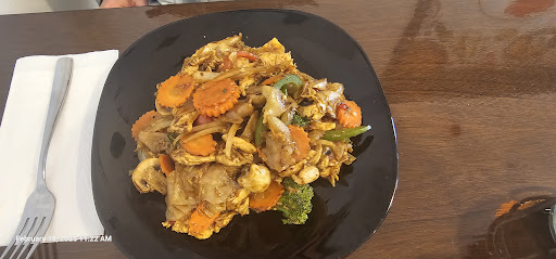 Lazy lunch day, decided I needed some Thai food. Upon entering @ 1 pm on a Tuesday, I was greeted by a glowy and enthusiastic young woman with a ton of excess energy. She greeted me, asked me if it was dine in or take out...take out. Offered me a glass of water. One of my go to Thai choices is green chicken curry. I decided on that as my first try of this establishment. It was a nice quick workday turn around out of the kitchen. Portion was the typical quart size container with the cup size rice portion. They had the choice of white or brown rice. A lovely traditional recipe with plenty of al dente vegetables. The standard spice level is just a mild with only a hint of zest...just enough to be interesting. I give this new place a 95% out of 100%. The only reason it is not a 100 out of 100 is that I was rather hoping for a lunch special and there was not one. So the entree was $15.95 and the side of rice was $2. So with tax it is a $20 bill. Will I return - absolutely. I will try the Phad Thai next time. It will just need to be a few times a year rather than a once per week lunch choice. I typically eat out once per work...