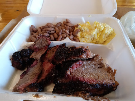 Stopped by to get some BBQ to go. The good- Was very happy to see all staff masked and behind plexiglass, and also outdoor seating if you want to stay and eat. The brisket was very good-mostly tender and moist. Personally I prefer a bit more spice and smoke flavor, especially for burnt ends. The pork ribs were also good. Now the bad-the sides are very boring. We ordered four pounds of meat and got 2 small containers of beans, which I thought was pretty skimpy for the amount of meat we bought (beans come with the meat). The beans tasted out of a can, with no flavor whatsoever. We also got a couple of containers of potato salad, which was pretty much potatoes with a mustard based dressing, pretty boring. No bread, onions or pickles with our $100+ order. They only do brisket, pork ribs and sausage, and it is all by the pound only. So I give the bbq we sampled 4 stars, 2 stars for the sides, 3 star average. Service...
