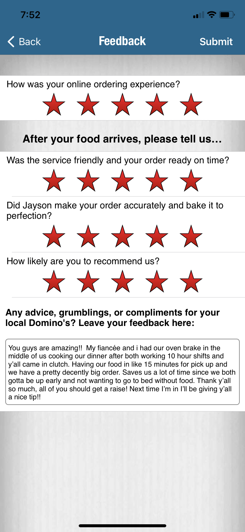 Ā Ā Ā Read moreIt's a pretty okay establishment, we have ordered from her pretty consistently over the last 2 or 3 months only about 15% of our orders have been wrong considering the time and amount of traffic they had it wasnt a huge deal and usually work with you pretty well in fixing the problem. I'd definitely eat here again in the future seeing as everyone is just doing there best at there job. Update, We are at 49$ of uncut pizzas (7 pizzas 4 orders) and unfortunately at this point have lost all hope with this establishment. Attached is a photo and of the 7 pizzas all were cut the same over 2 months.. its extremely disappointing to have a place of food operating that can't even cut your pizza. I've attempted contacting dominoes through there service portals for customer service with no response and zero help, there is zero accountability for your dollar when shopping at dominoes I would not expect your food to be right and expect even more they will get away with it. I'm at a loss for a company ran on this business model will probably just...
