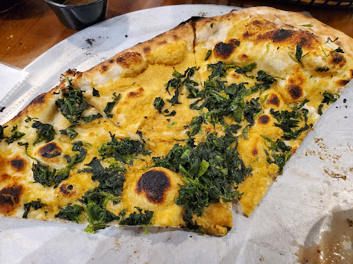 The crust was thin and soggy, with a chewy, wet texture, but somehow burnt at the same time. I don't know when "wood-fired" became synonymous with "burnt black" but that's what we got. Couldn't even really taste the pizza toppings over the taste of ash. The top was covered in 5-6 medium to large air bubbles that had completely blackened as well. We were impressed with the amount of spinach we got on top, but the other toppings were incredibly sparce. I don't even know if it had any cheese, and the sauce was just plopped on the top in globs. The crust was nearly 1/3 of the slice, and so burnt it was inedible.