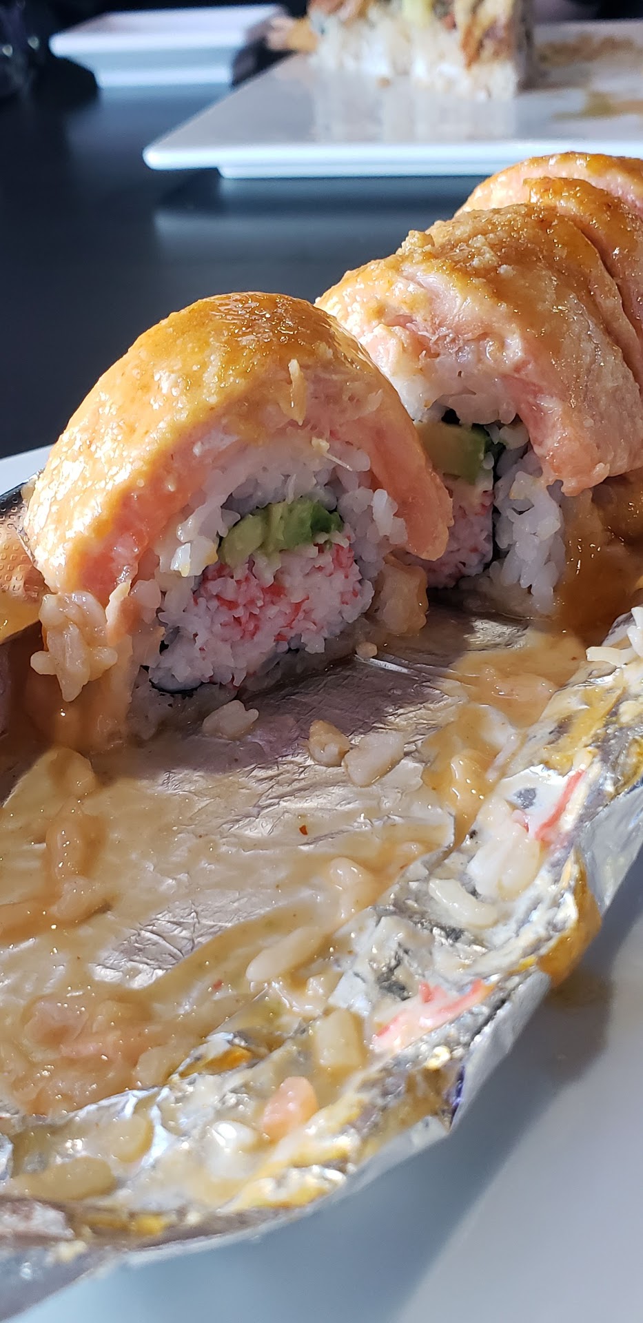 The food was delicious, beautifully presented. We got the sashimi tacos, and monkey brain as appetizers. The monkey brain, is the most beautifully crafted and delicious thing I have ever eaten, highly recommended. I also got the lion king roll, it was one of the baked rolls, the salmon was very tender and that was also very good.
