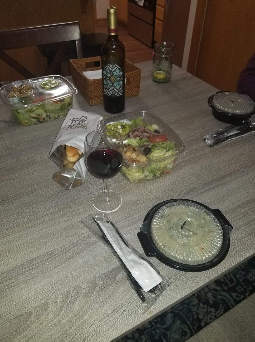 When we got our breadsticks, which are usually heavenly and soft and so well-flavored and fresh and I was so looking forward to - ohhhh no. Our breadsticks weren't hot, they didn't have much of the signature garlic salt flavor on them, and the texture was tough and almost dry like they were old. (Actually, the texture was exactly how the breadsticks were when we used to order and pick-up from Olive Garden in another state, and had to drive over 1hr to get home, and then had to reheat them in the bag provided.) Not good at all, and certainly not what I ever thought I'd experience in the actual restaurant! And, one of the breadsticks was torn in half when we got it. 🤦🏽♀️ Why? And also, we never were asked if we wanted more - which was always the best part, to me, to have endless breadsticks that were steaming hot and whetting the appetite.