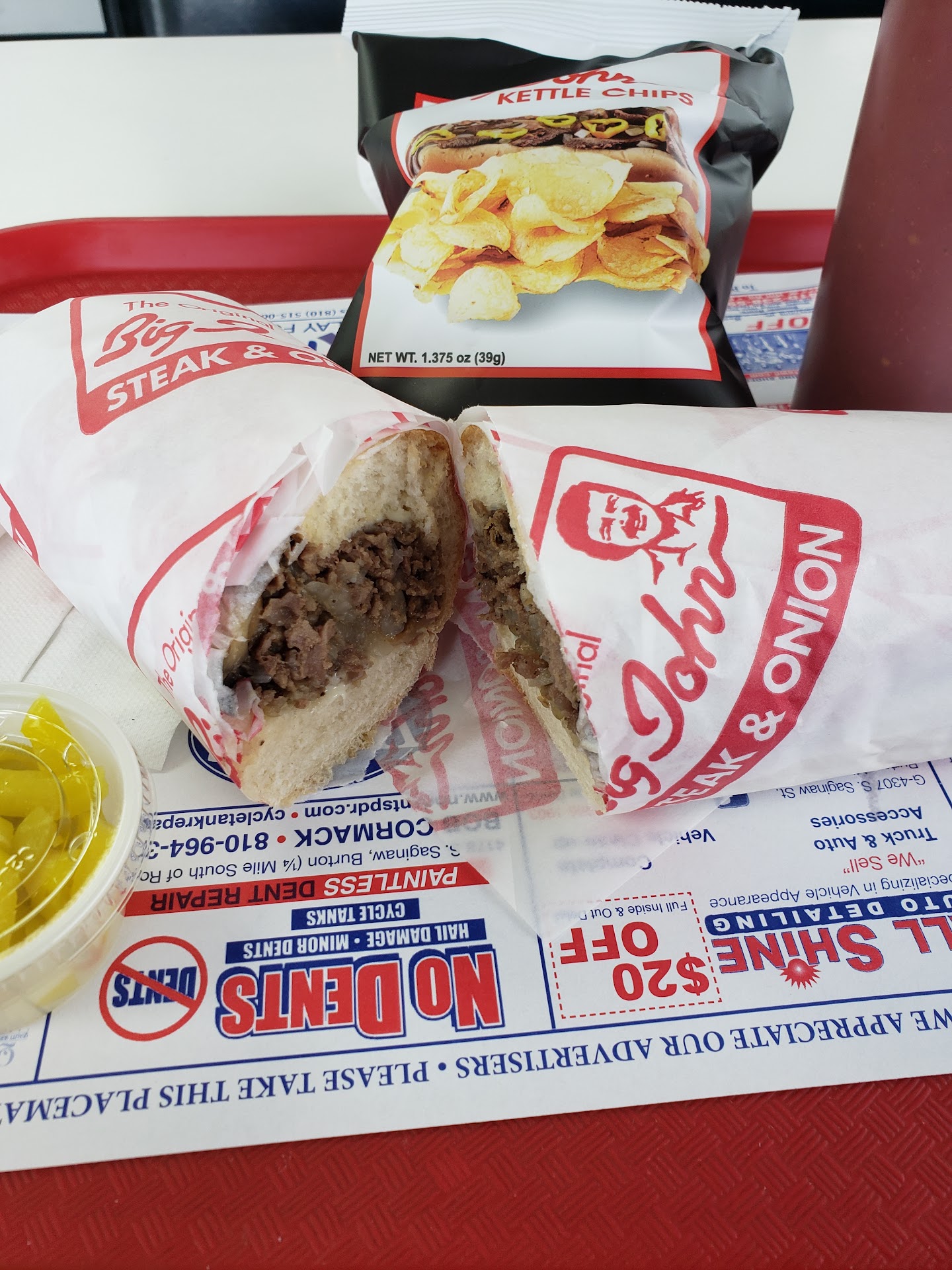 Read moreI love big John steak and onions. Always reminds me of my childhood and how my grandma and grandpa used to take us kids every weekend. Something about the smell when you walk in the door is just breathtaking. Definitely can take you back. I always get a 12-inch steak sub with mushrooms green peppers and extra cheese. Yummy! The service of this particular location is phenomenal. Everyone who works there is super nice place is super clean and it's just a great atmosphere. I highly suggest this place. Whether it's lunch or dinner. Also a great family environment and a nice place to...