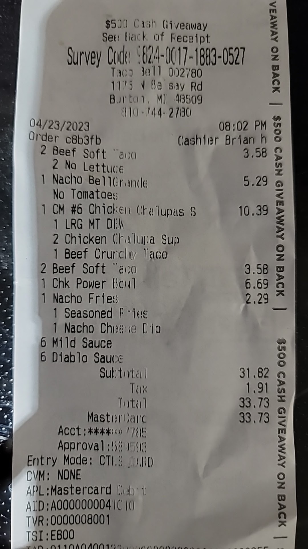 The menu has been ensmallened to a degree that it is nearly unreadable. I believe that there are calorie counts provided but I could hardly read the items and prices - obviously Taco Bell doesn't want its customers reading about the calories in its offerings.