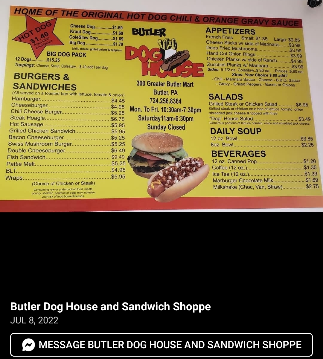 Read moreThe Butler Dog House is carrying on the tradition of the Butler Hot Dog Shoppe. By no means is this a restaurant that would rival Ruth's Chris, but for a tasty, quick lunch this is a great place. Try a dog with chili, onion, and pickle. Get gravy on your fries. Yes, the gravy and the chili might be dripped on the bun or tray. If that's the worst thing that happens to you, you're doing well. In fancy restaurants, they drizzle sauce across the sushi and onto the plate. It's character. The staff seems a bit gruff, but they are all great, hard-working people. They are there to serve yummy food...and they...