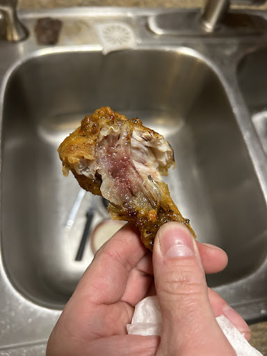 Nothing like boiled first then oven finished & undercooked wings. The meat on the inside was juicy / watery, but really mushy. A few were raw / pink on the inside.