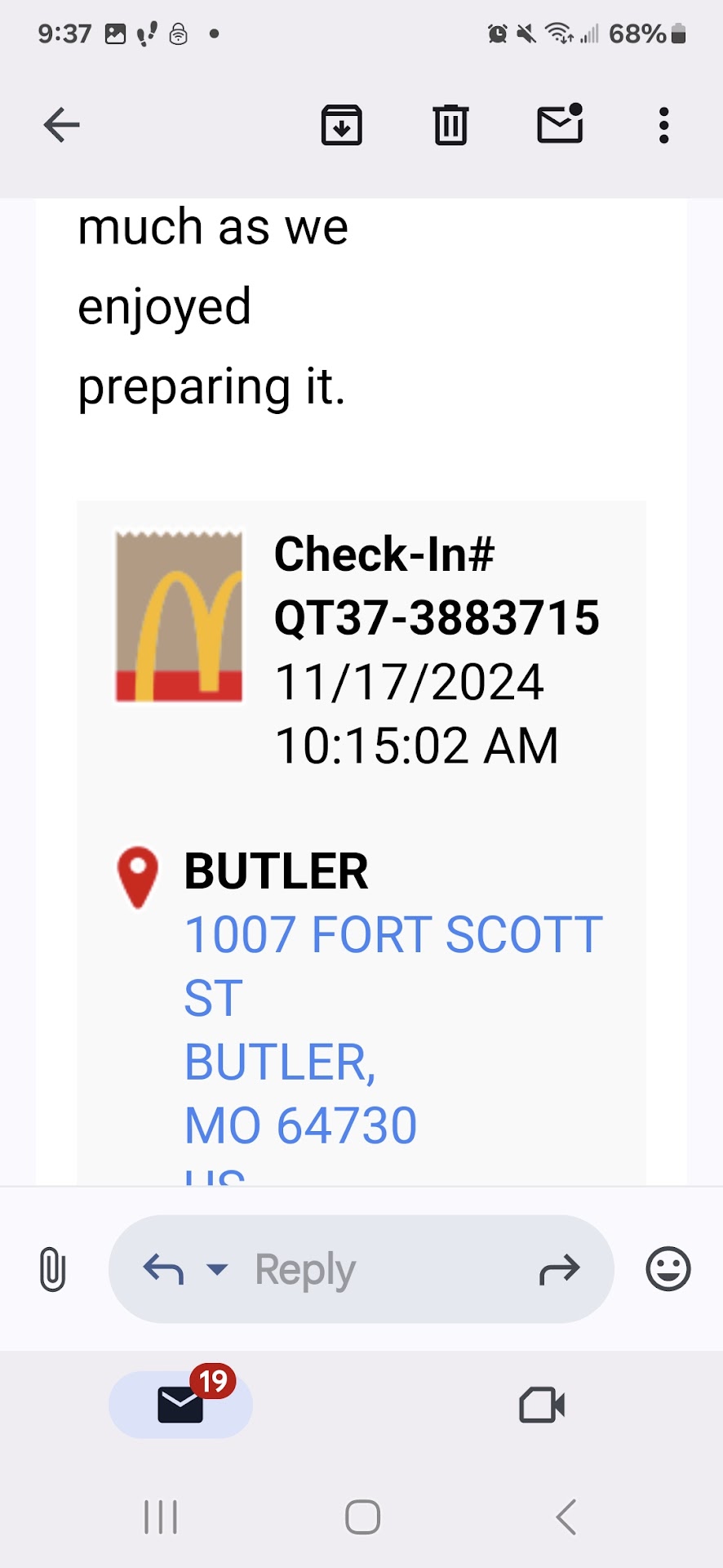 Read moreLook, it's Mcdonald's right?? Seems like EVERY time we go threw the drive thru something fails right? Well not this time! Yep that's right...we actually had a GREAT experience. It was 11:15pm ish, we were tired returning home to KC from a wedding we'd been at all day in Joplin. Told the wife "f it I'm starving I need something." The gentleman behind the mic was very polite and asked if it was ok we waited 6 minutes for the chicken sandwich I ordered to be cooked. We said no problem and pulled up to the first window. My wife had since changed her mind from the 2 seconds it took to get there from a medium tea to a large which they easily said "no problem" and the woman radio'd ahead for no extra charge. About 6 minutes later out pops the food and it was ALL fresh!! Might I add there was even the BBQ and Honey Mustard packages the wife had requested in there as well!!!!!! Now I'm m not saying nor expecting each and everyone's McDonald's experience here will be the same. Hell I think I actually had a once in a life time experience myself, but if it wasn't and this crew is that good all the time....Butler you have something special. đđ Guy in...